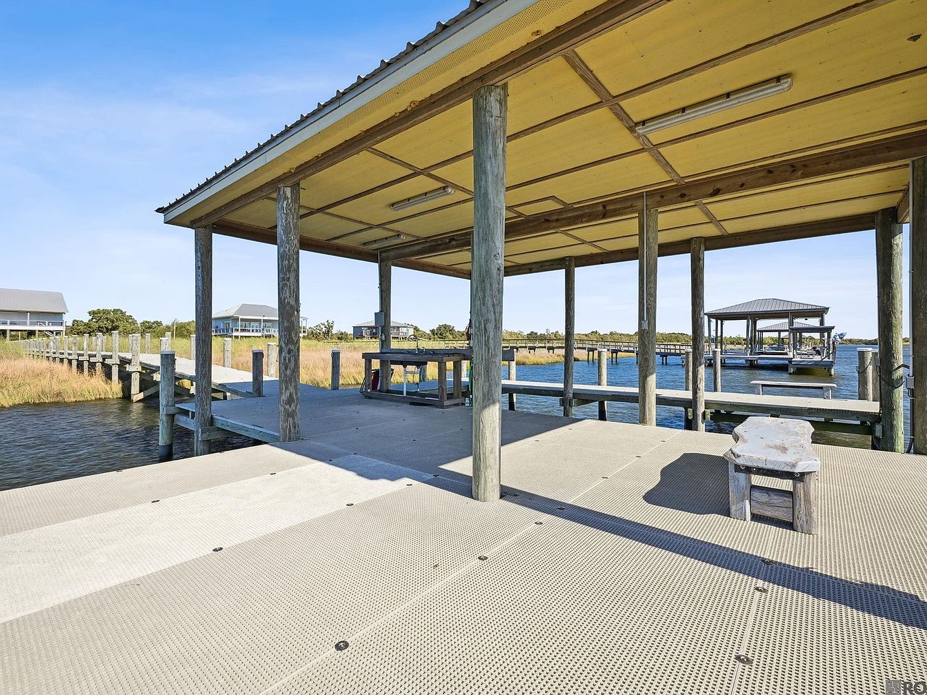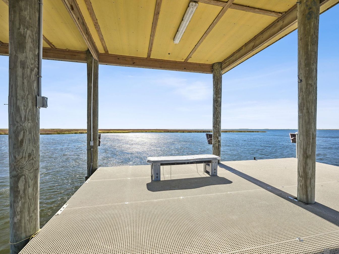 This spacious dock area is characterized by a raised wooden structure, supported by durable posts, offering an open, airy feel. The flooring, composed of textured, slip-resistant materials, blends functionality with safety. A simple wooden bench sits unobtrusively, inviting relaxation while enjoying scenic water views. Beyond the dock, a shallow waterway reflects the clear blue sky, bordered by tall grasses swaying gently in the breeze. Nearby structures, visible in the background, indicate a tranquil residential setting. The overall aesthetic merges rustic charm with practical design, ideal for leisurely outdoor activities or quiet reflection by the water.