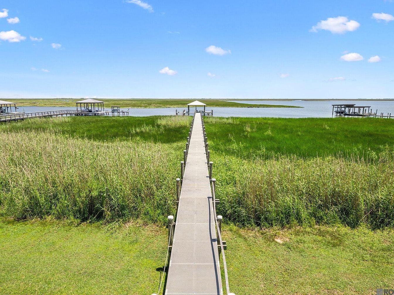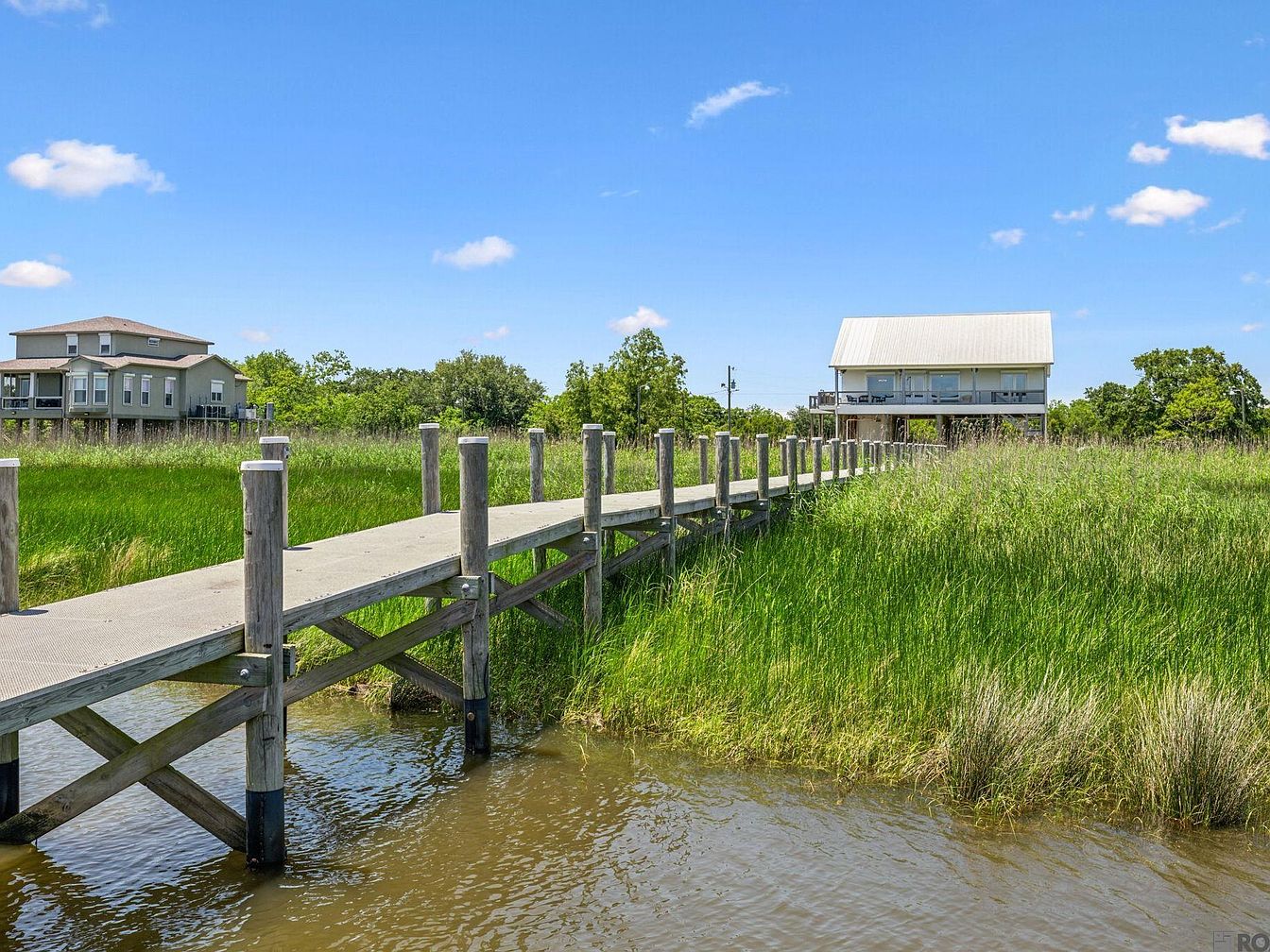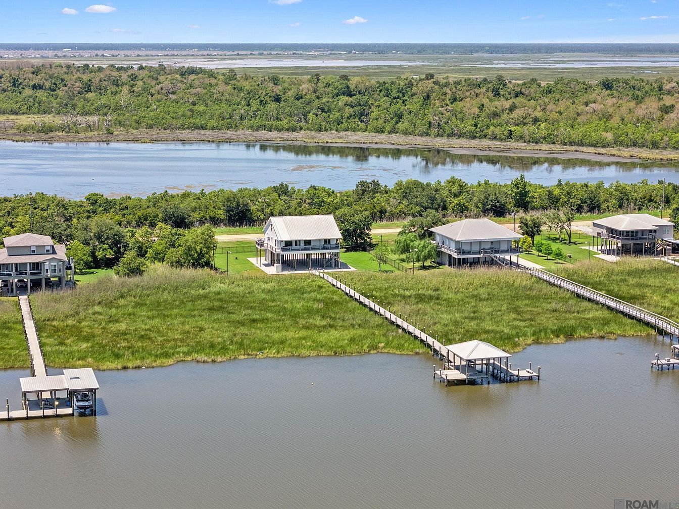 A scenic view of a waterfront neighborhood featuring several elevated homes, built on stilts, designed to withstand potential flooding. Each house has a light color scheme, harmonizing with the natural surroundings. Wide wooden walkways connect the homes to the shoreline, leading to small boat docks. Lush green lawns and tall grasses enhance the outdoor aesthetics, creating a tranquil atmosphere. The backdrop features a serene river, reflecting the sky and bordered by verdant trees. The expansive view showcases the seamless blend of nature and residential living, encapsulating a relaxed, coastal lifestyle.