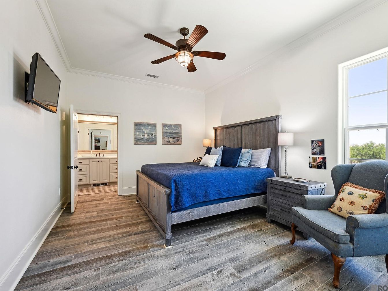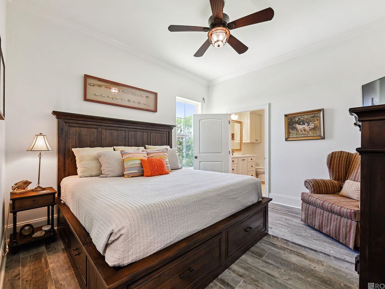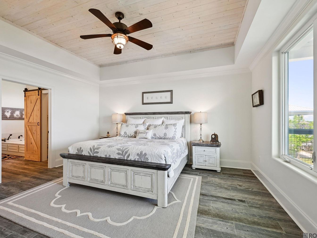 This bedroom showcases a serene, inviting design with a soft color palette of whites and grays. A large, plush bed with decorative pillows and a textured quilt sits center stage on a light rug featuring subtle designs. Wooden, weathered floorboards add warmth to the space, complemented by a rustic ceiling fan that offers both style and comfort. To the side, a nightstand with a lamp casts a gentle glow, enhancing the ambiance. The room features a cozy barn-style door leading to an ensuite bathroom, adding a contemporary touch to the traditional elements, while large windows invite natural light.