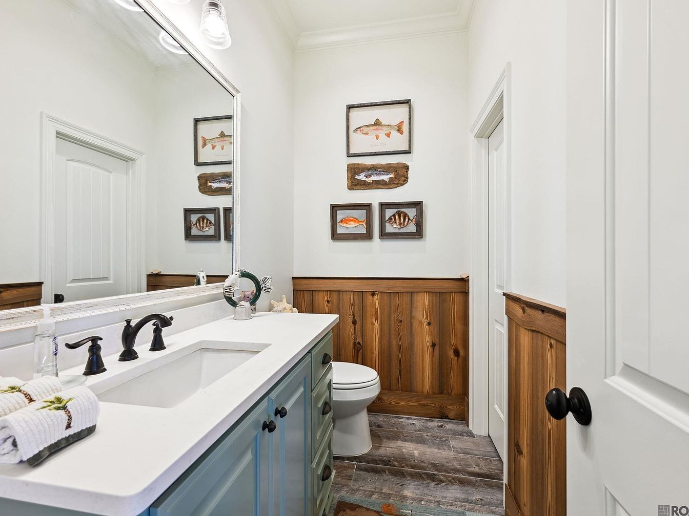 A cozy bathroom featuring a blend of modern and rustic elements. The walls are painted a soft white, contrasting beautifully with the natural wood paneling that lines the lower half. A large mirror hangs above a light turquoise vanity with black hardware, adding a splash of color. The countertop boasts a minimalist design, accented by a small round sink and stylish, contemporary black faucets. Framed fish art decorates the wall, enhancing the water-themed aesthetic. A white ceramic toilet is situated discreetly in the corner, while plush towels with green accents neatly rest on the counter, inviting comfort.