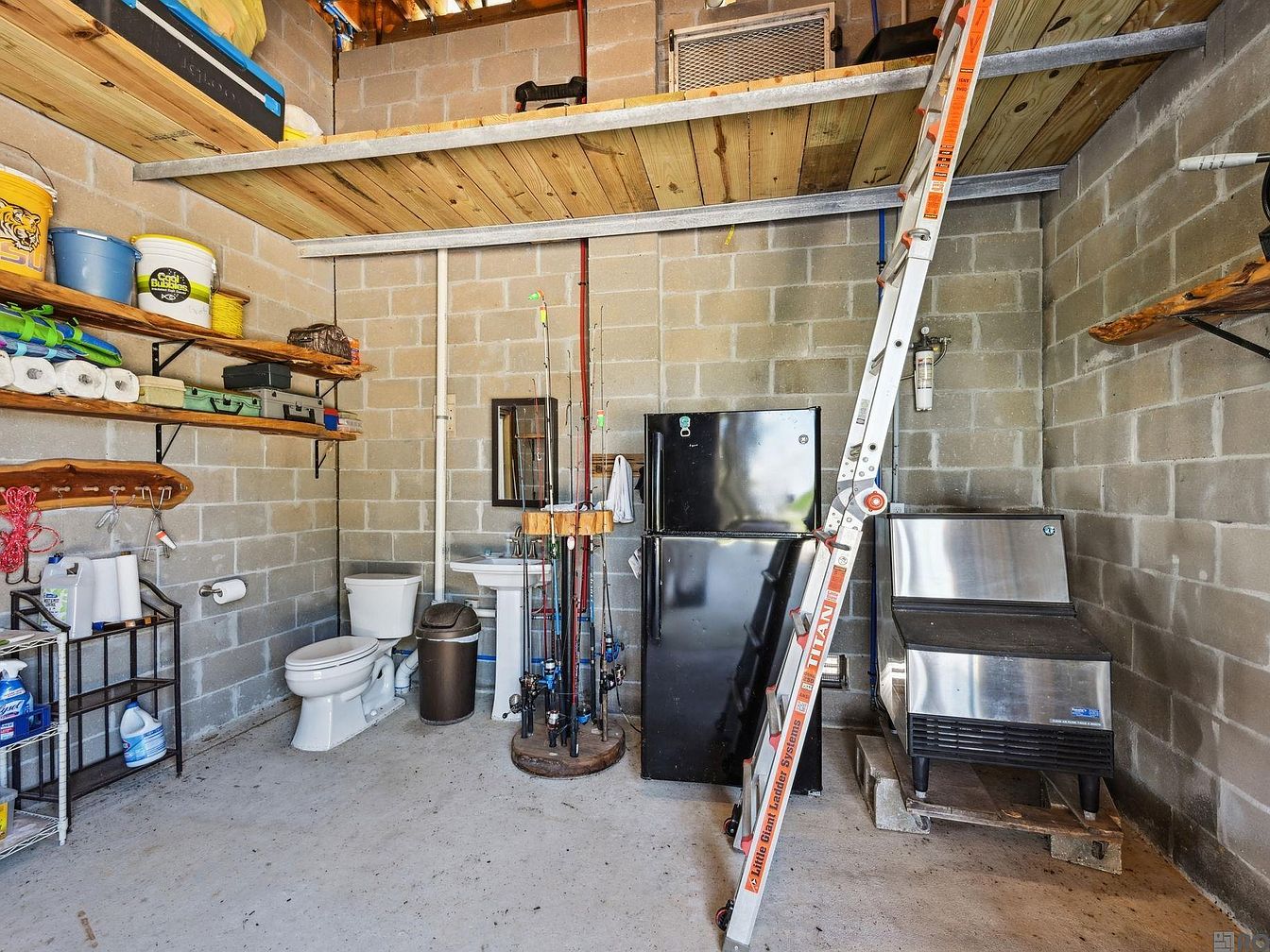 This utility room features a functional yet cluttered layout with practical design elements. The walls are constructed of exposed gray cinder blocks, creating an industrial feel. Shelving units made of dark wood store various supplies, including buckets and fishing gear. A black refrigerator stands prominently against the wall, alongside a large, shiny stainless steel appliance. To the side, a compact bathroom area contains a toilet and a small mirror. The floor is a simple concrete, while overhead, a wooden loft provides additional storage. A ladder leans against the wall, emphasizing the utilitarian and busy nature of the space.