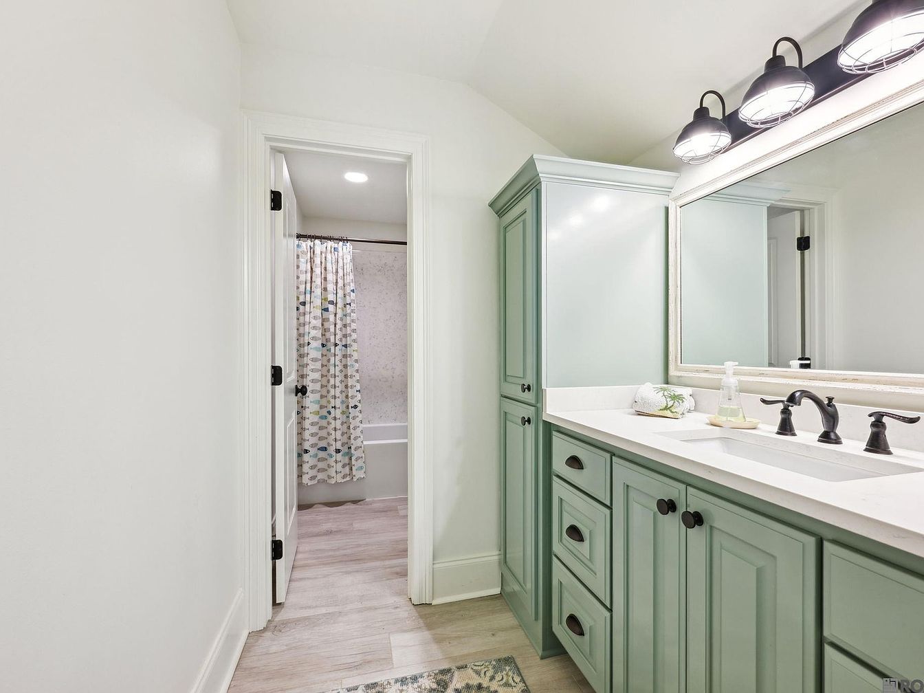 This bathroom features a blend of modern and rustic design. Soft green cabinetry complements a white countertop, while black faucet fixtures add a striking contrast. Light hardwood flooring extends seamlessly, enhancing the spacious feel. A large mirror above the sink reflects natural light and opens the space visually. A plush area rug provides warmth underfoot. To the left, an open doorway reveals a bathtub area, adorned with a patterned shower curtain that introduces playful colors. Smooth white walls and subtle architectural details, such as crown molding, create an airy ambiance, making the room inviting and functional.