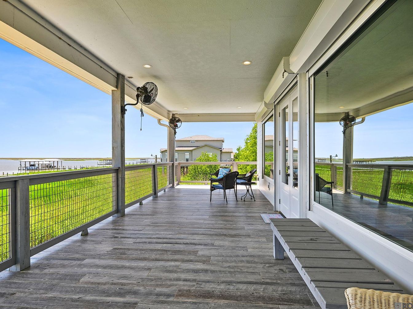 This covered porch features a spacious layout with wide, gray wood flooring complemented by sleek paneling. Overhead lighting creates a warm ambiance, while dual ceiling fans provide comfort on warmer days. A glass railing enhances the view, allowing for unobstructed sightlines to the lush green lawn and serene waterfront beyond. Dark wicker chairs are strategically placed around a small table, inviting relaxation and conversation. Large sliding glass doors reflect the outdoor scenery, seamlessly connecting the indoor and outdoor spaces. The subtle color palette of natural wood tones and earthy greens fosters a tranquil atmosphere perfect for leisurely afternoons.