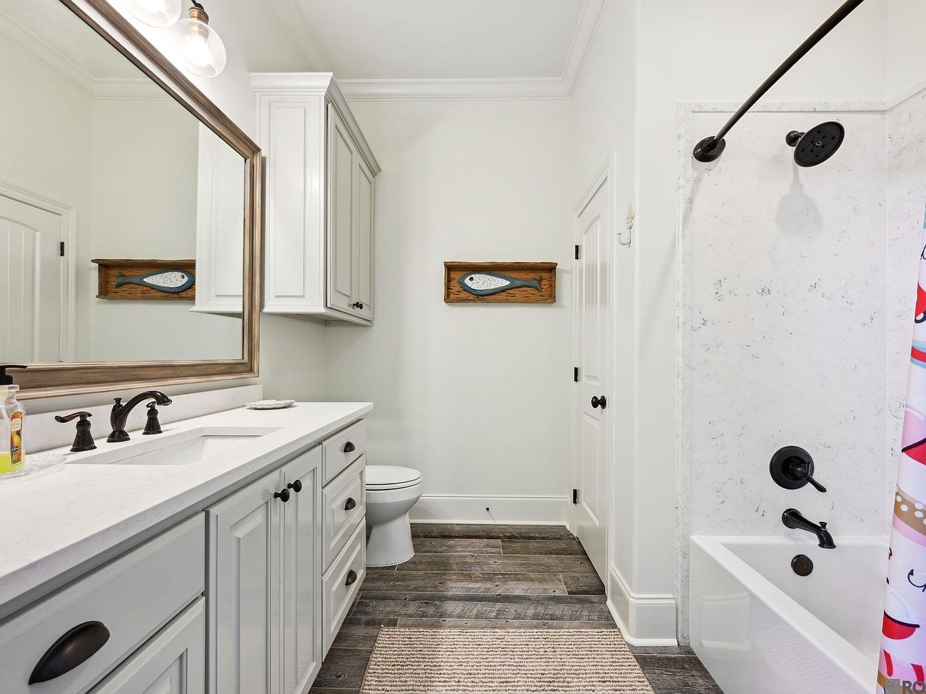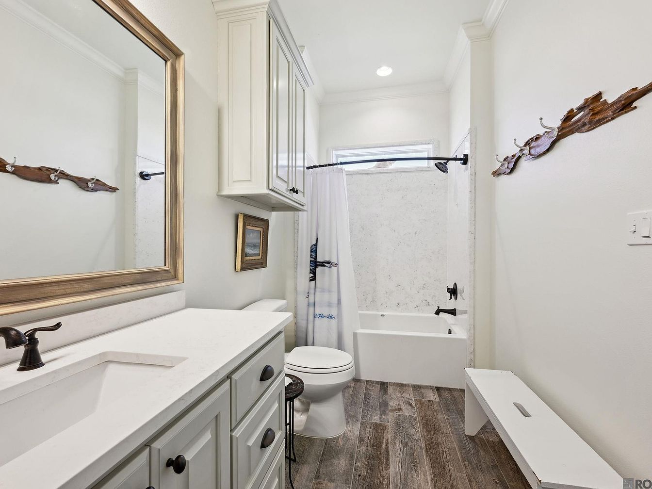 This bathroom showcases a bright and airy design with a sophisticated layout. The color scheme features whites and soft grays, accentuated by the warmth of wood tones. A large, framed mirror above the double sink enhances the sense of space, while the sleek white cabinetry offers ample storage. Stylish dark fixtures and knobs contrast nicely against the cabinetry. The flooring consists of rustic wood planks, adding texture and warmth. A tasteful wooden shelf displays a decorative fish, tying into a subtle nautical theme. The shower area features a modern curtain, and the overall aesthetic strikes a perfect balance between contemporary elegance and comfort.
