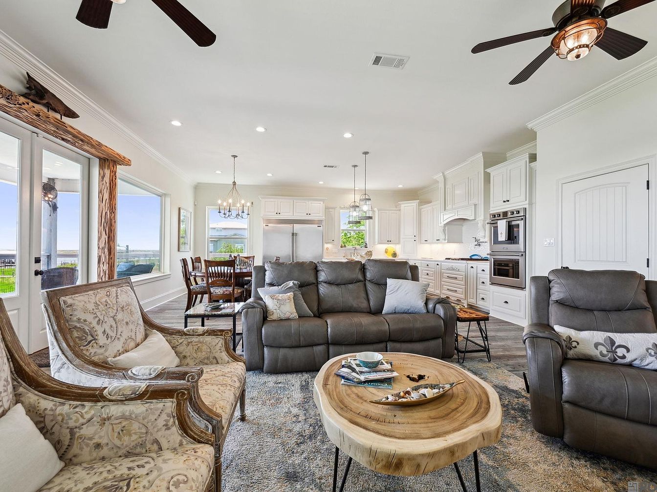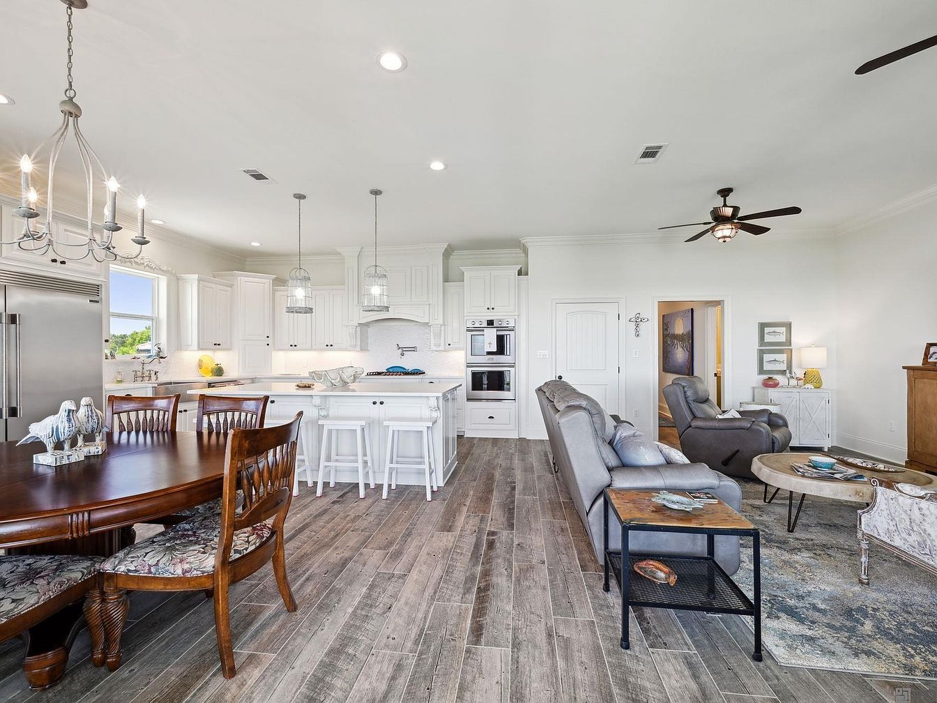 This spacious open-concept area combines the kitchen, dining, and living spaces, creating a warm and inviting atmosphere. The kitchen features white cabinetry and sleek countertops, complemented by stylish pendant lights. A large dining table with carved wooden chairs highlights elegance, while the textured wood flooring adds warmth. Adjacent, the cozy living area showcases plush gray sofas and a round coffee table, harmonizing comfort with style. Subtle decorative accents like artwork and ceramic pieces enhance the aesthetic. Natural light floods in through windows, marrying indoor and outdoor spaces effortlessly, while ceiling fans ensure a gentle breeze.
