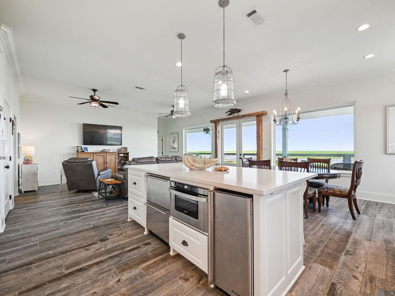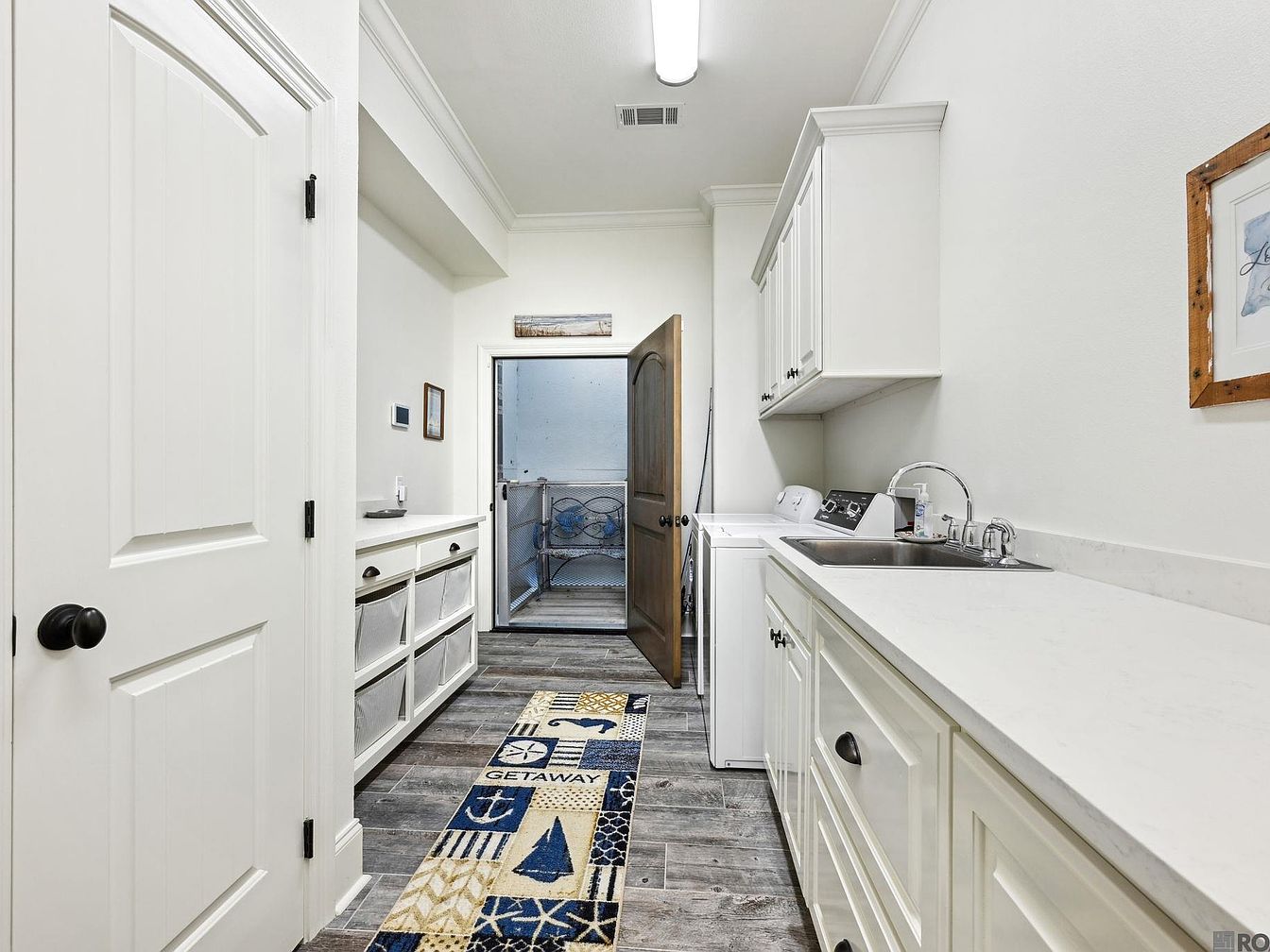 This modern coastal retreat, built just under six years ago, epitomizes luxury living with five spacious bedrooms, each featuring private bathrooms and walk-in closets. Located in Slidell, Louisiana, this home boasts a cutting-edge open floor plan with elegant porcelain tile and a gourmet kitchen equipped for all culinary adventures. Recent renovations include a convenient laundry lift and storm shutters, ensuring safety and accessibility. Priced at $1,175,000, the residence sits on a substantial landscaped lot, enhanced by outdoor amenities like a boathouse and concrete pier for fishing. Its design harmonizes with the serene coastal environment, making it ideal for both luxurious living and outdoor enthusiasts.