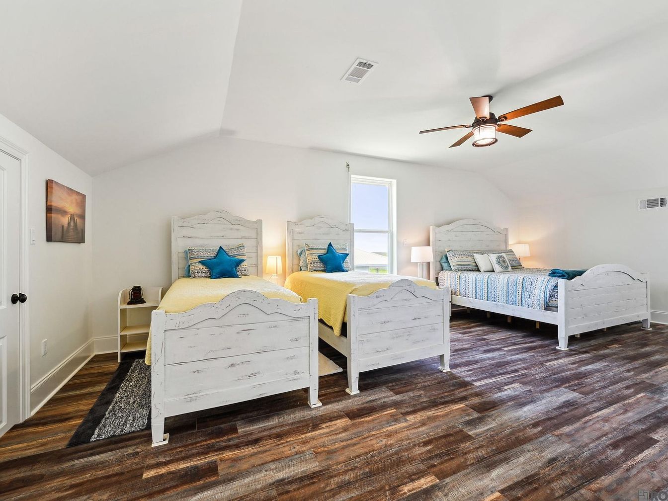 The spacious bedroom features two vintage-style wooden beds with whitewashed finishes, adding a rustic charm. Each bed is adorned with vibrant blue star-shaped pillows and yellow bedding, creating a cheerful contrast. The room’s color palette is light and airy, dominated by neutral tones on the walls and warm browns in the hardwood flooring. A large window allows natural light to flood the space, enhancing its brightness. Beside the beds, sleek bedside tables hold modern lamps, while a simple artwork piece adds character to the wall. The ceiling fan complements the room’s layout, providing comfort and style.