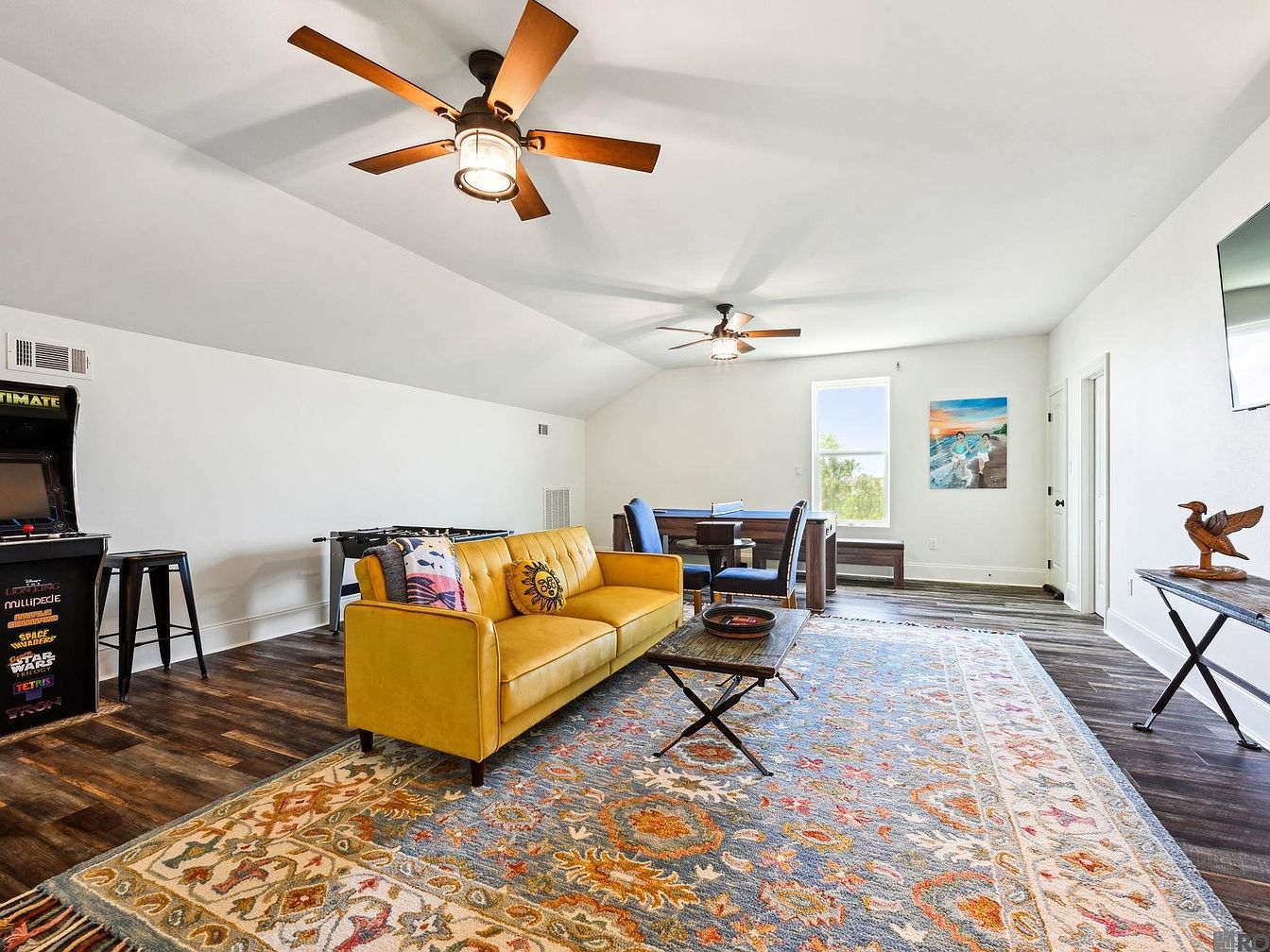 This living room features a bright yellow leather sofa, complemented by a geometric area rug showcasing intricate patterns in earthy tones. The space is defined by a high, sloping ceiling and natural light streaming through a large window, illuminating the wood flooring. Two ceiling fans enhance the airy feel. A cozy dining area includes a dark wood table with blue upholstered chairs, integrating a modern touch with traditional elements. An arcade machine stands against the wall, blending nostalgia with contemporary style. Artwork brings vibrant color to the space, harmonizing with the overall warmth and inviting atmosphere.