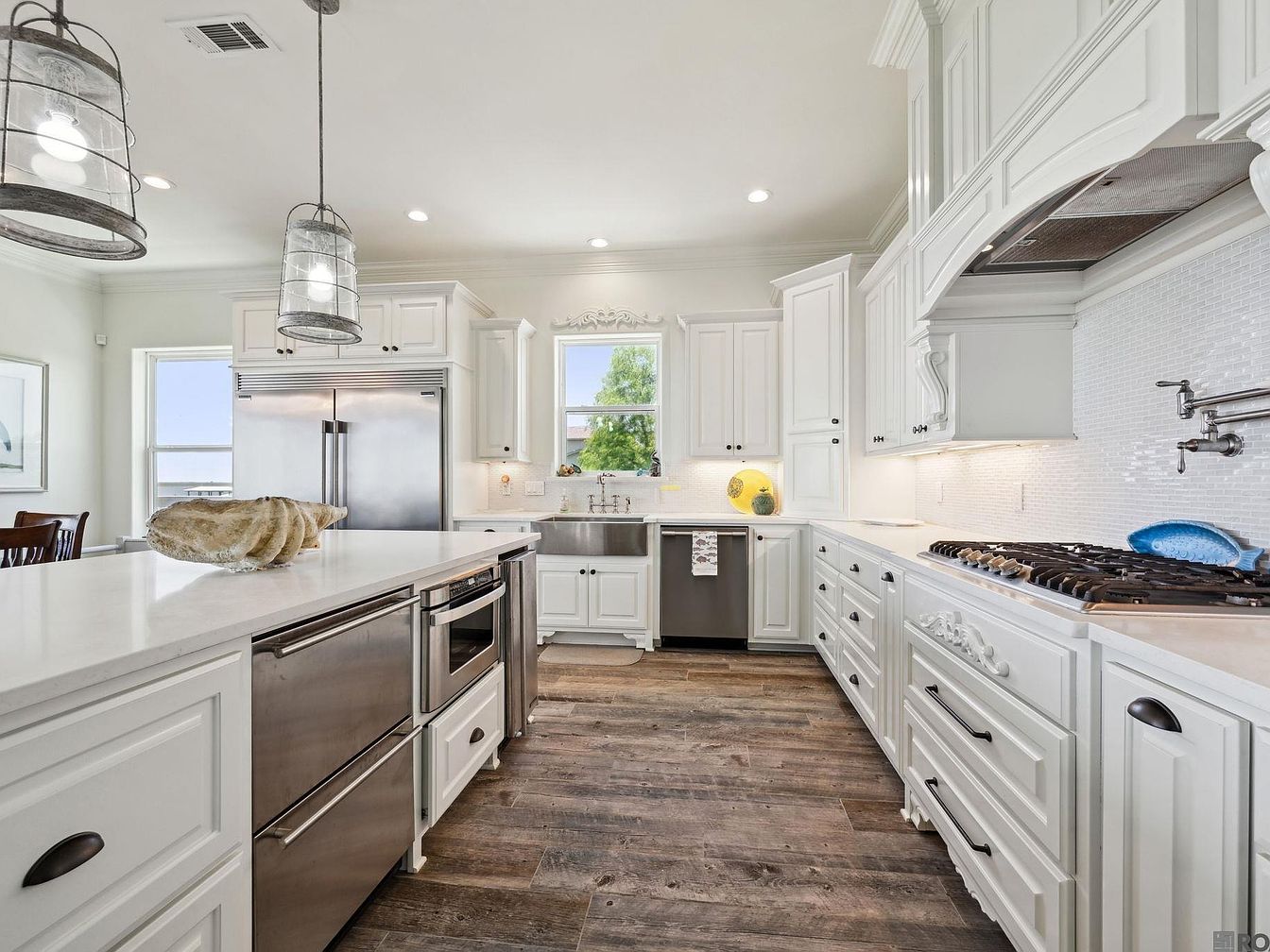 This modern kitchen features a bright and airy layout with white cabinetry and stainless steel appliances, creating a clean and inviting atmosphere. The spacious island is elegantly topped with a white countertop, providing ample space for meal preparation. Three industrial-style pendant lights hang above the island, adding a touch of charm. The flooring consists of warm wooden planks, contrasting beautifully with the cabinetry. A large window allows natural light to flood the space, highlighting the glossy subway tile backsplash. The sleek design integrates functionality with aesthetics, ensuring the kitchen is both practical and visually appealing.