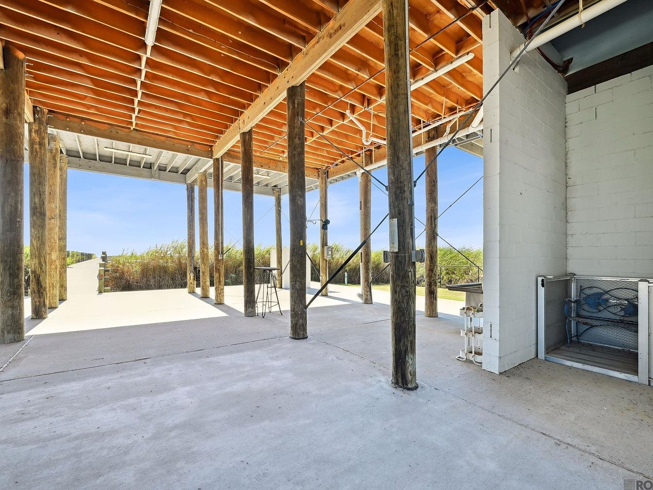 An open, elevated patio featuring a concrete floor supported by sturdy wooden posts, creating an airy, outdoor atmosphere. The ceiling reveals exposed beams, showcasing the construction’s rustic charm. Natural light filters through, enhancing the spacious feel. Against the walls, a corner houses a metal structure, possibly for storage, while the unobstructed view invites the surrounding greenery into the space. The structure allows for clear sightlines, connecting indoors and outdoors. Adjacent pathways lead towards lush grasses, highlighting a serene coastal lifestyle. Minimal furnishings suggest versatility for gatherings or relaxation amidst nature’s backdrop.