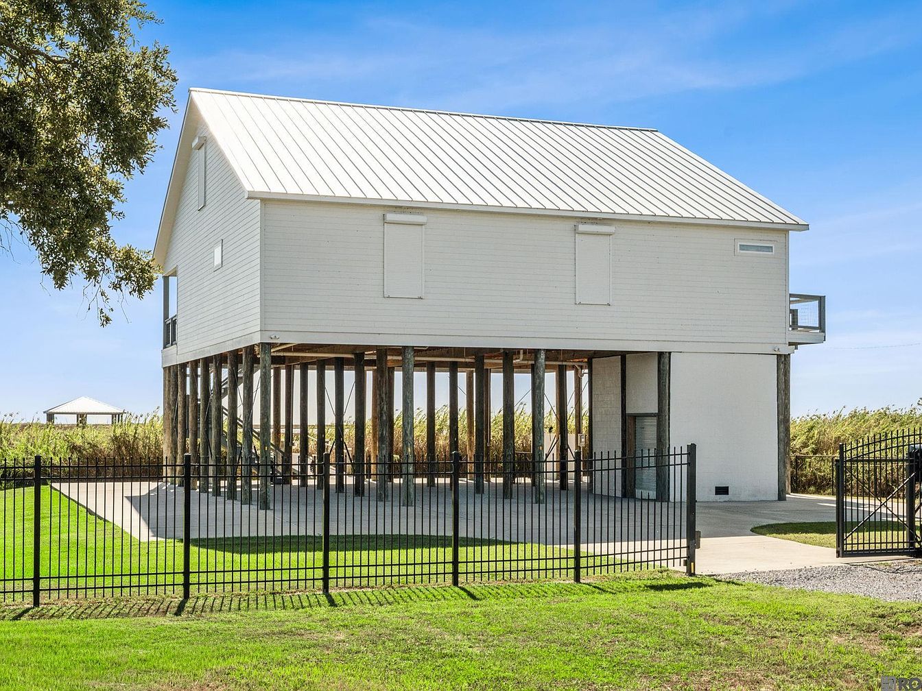 This image shows a raised coastal home with a modern aesthetic. The house features a clean white exterior with a sharp, sloped metal roof that reflects sunlight. It is elevated on sturdy wooden columns, creating a spacious area underneath, ideal for parking or outdoor activities. A black iron fence surrounds the landscaped yard, which includes lush green grass and a concrete patio area. Large square windows and minimalistic design elements contribute to a contemporary feel. The property conveys a blend of functionality and style, suitable for coastal living, with surrounding natural greenery enhancing its charm.
