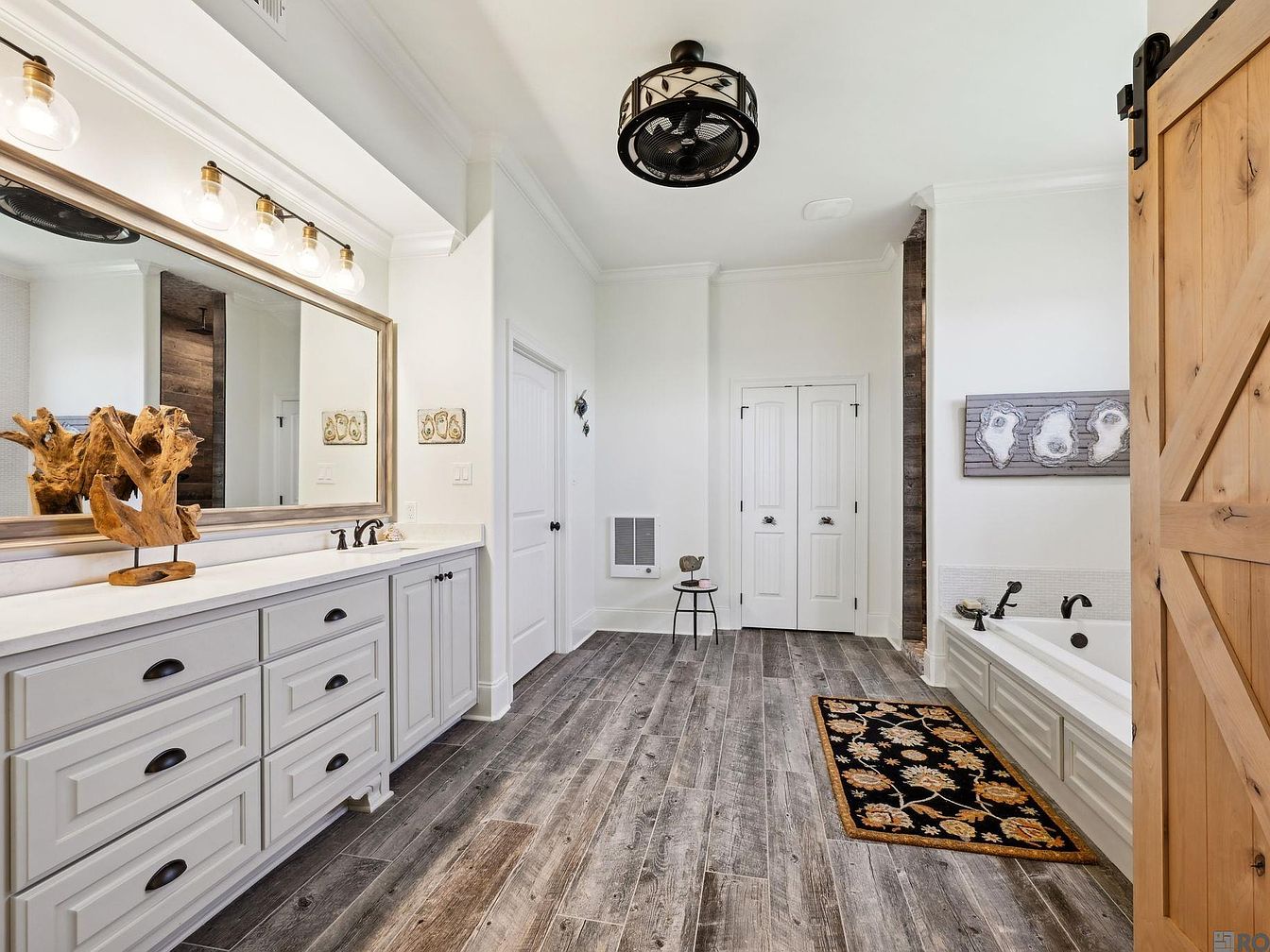 This spacious bathroom features a harmonious blend of modern and rustic elements. A long white vanity with black handles offers ample storage beneath dual sinks, illuminated by stylish light fixtures. The expansive mirror enhances the sense of space, reflecting the soft natural light. A wood-textured accent wall adds warmth, contrasting with the sleek white tile surrounding the luxurious soaking tub. A decorative area rug with intricate patterns brings color to the hardwood-style flooring, while a minimalist stool stands nearby. The overall color scheme is serene, incorporating whites, blacks, and natural wood tones, creating a tranquil and inviting ambiance.