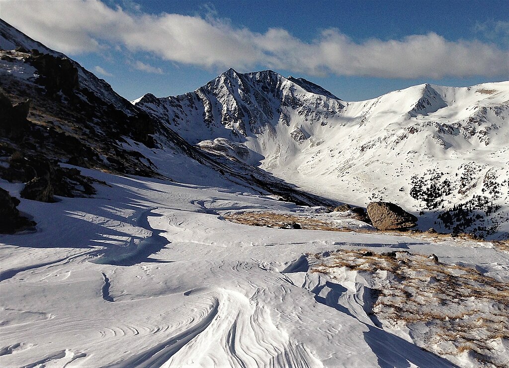 Wind slab forms when strong winds lift loose crystals from exposed ridges and forcefully pack them onto leeward slopes, creating a stiff surface that often looks smooth and inviting. Travelers may feel solid footing for a moment, then hear cracks shoot across the surface as the top layer begins to separate from weaker snow hidden below. These slabs can break under a single step and may slide downslope as one piece. In steep terrain, this creates a serious hazard, since a slab can carry a person with it and trigger a larger release.