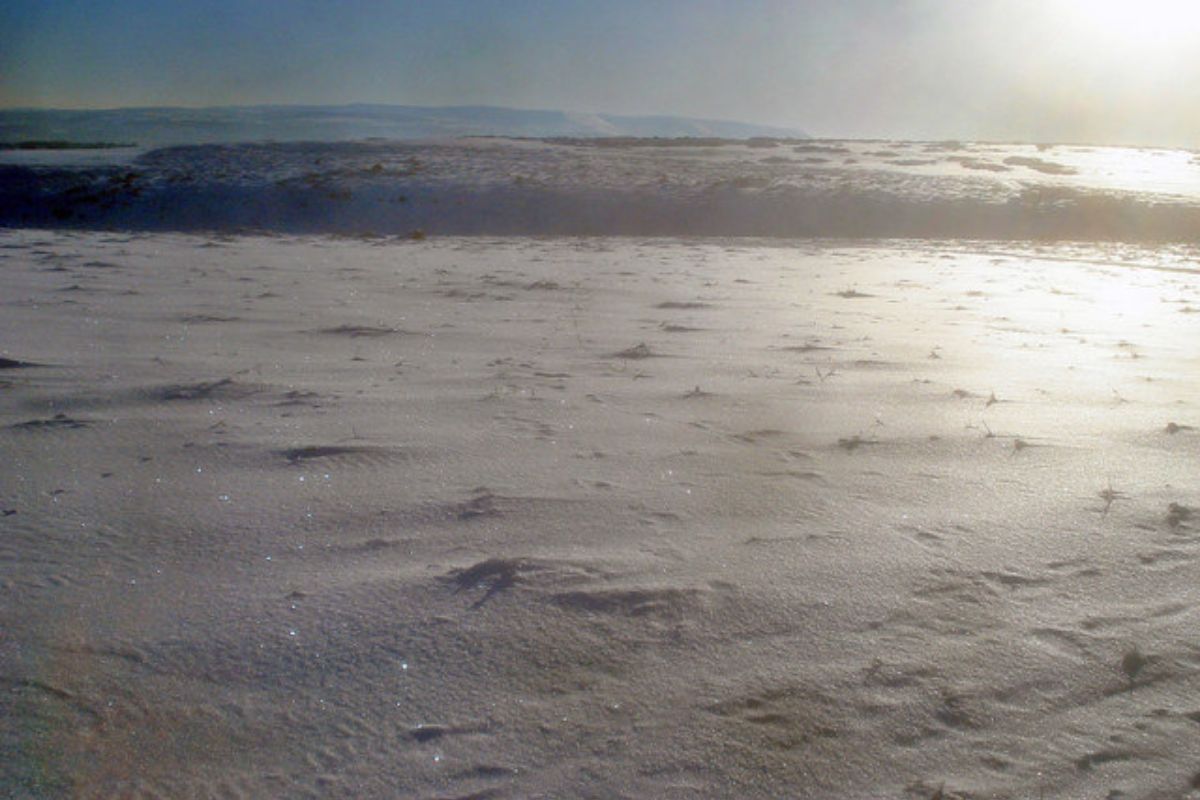 Faceted snow develops during long, cold nights when strong temperature gradients inside the snowpack transform bonded crystals into sharp, loose grains that resemble coarse sugar. This type of snow cannot hold weight and often collapses beneath a traveler’s feet, causing sudden drops that make movement tiring and unpredictable. The lack of cohesion also contributes to deep slab instability on slopes. Even flat ground can turn difficult as each step sinks unevenly into the sugary layer.