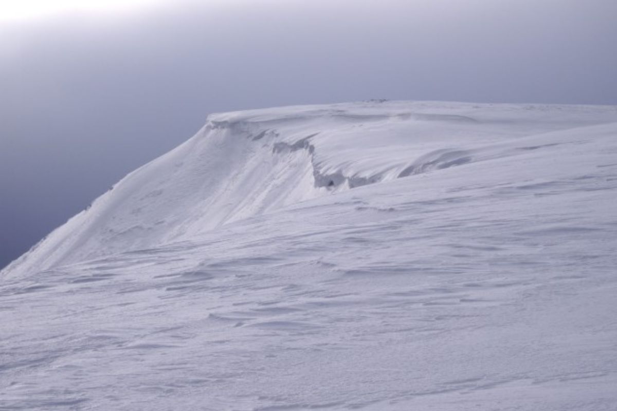 Cornices develop when strong winds carry snow over ridge edges, creating large overhanging shelves that look solid but extend beyond the true ground beneath. These features can fail instantly under a hiker’s weight, breaking away in massive chunks that tumble down steep terrain. A person standing on a cornice may not realize the void below them until it collapses. Even small collapses can drag someone downhill. Cornices must always be approached from a safe distance.