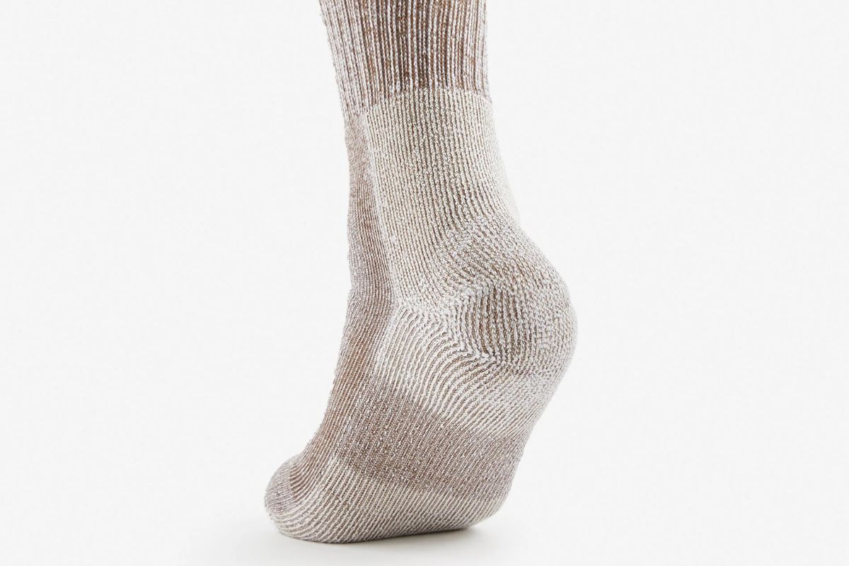 Wrightsock’s Coolmesh II Crew uses a dual-layer system to combat blisters, with an inner layer that moves with the foot and an outer layer that absorbs friction. The result is reduced hotspots and improved comfort on long treks. Made from a blend of synthetic fibers, these socks are lightweight, breathable, and quick-drying, making them ideal for warm-weather hikes. Testers appreciated how cool and comfortable they stayed even after hours of use. For blister-prone hikers, these socks are a dependable choice.