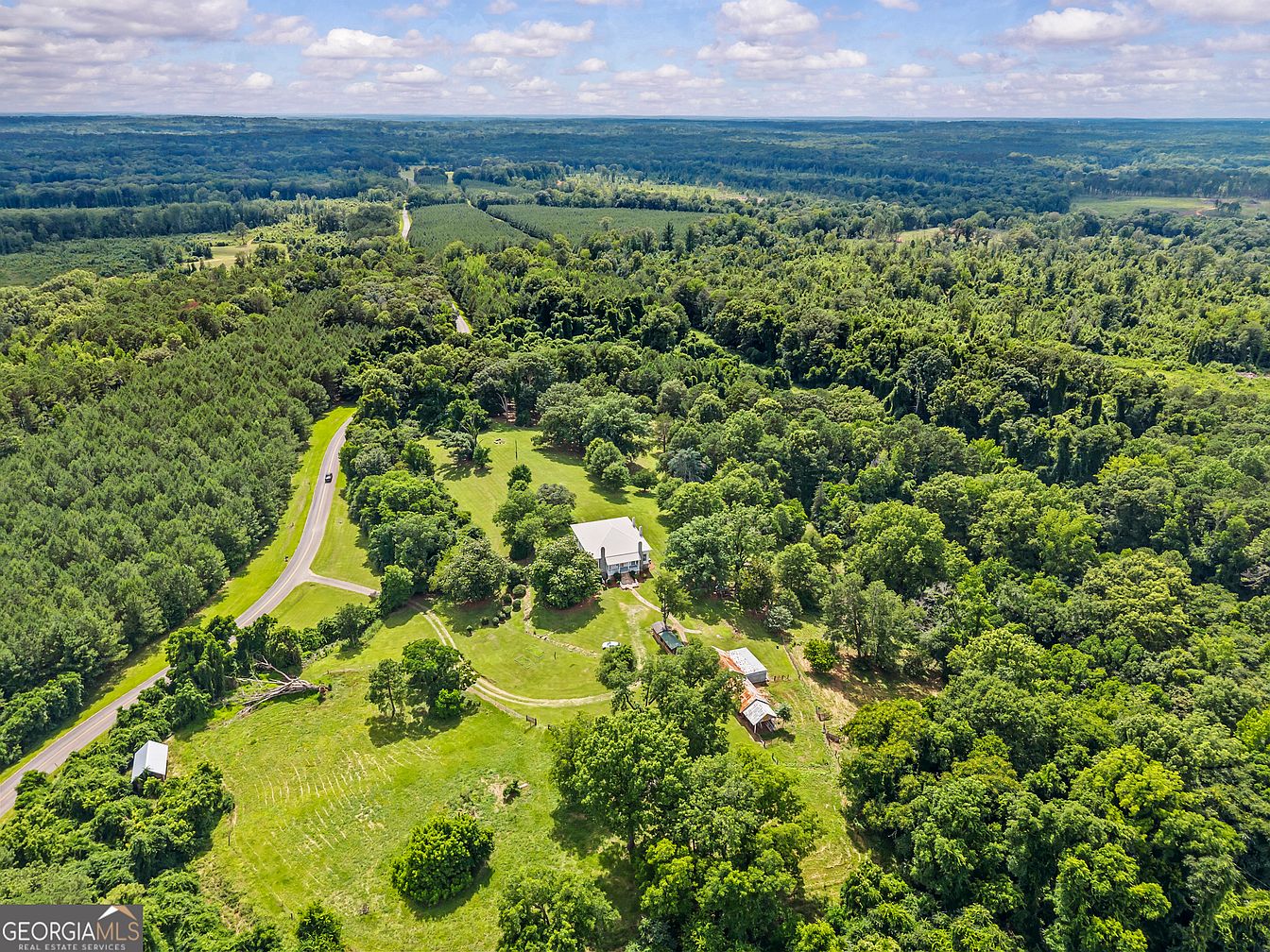 A sprawling rural estate seen from above, surrounded by dense forest and expansive open fields. A historic white house sits near the center, accented by a wide front lawn dotted with mature trees and smaller outbuildings clustered nearby. Winding gravel and dirt paths connect the home’s driveway to the surrounding buildings and the main road, which curves in from the left through a corridor of pine trees. The landscape features lush greenery, open meadow areas, and a sense of privacy with the thick woods that encircle the property, evoking tranquility and seclusion in a classic Southern countryside setting.