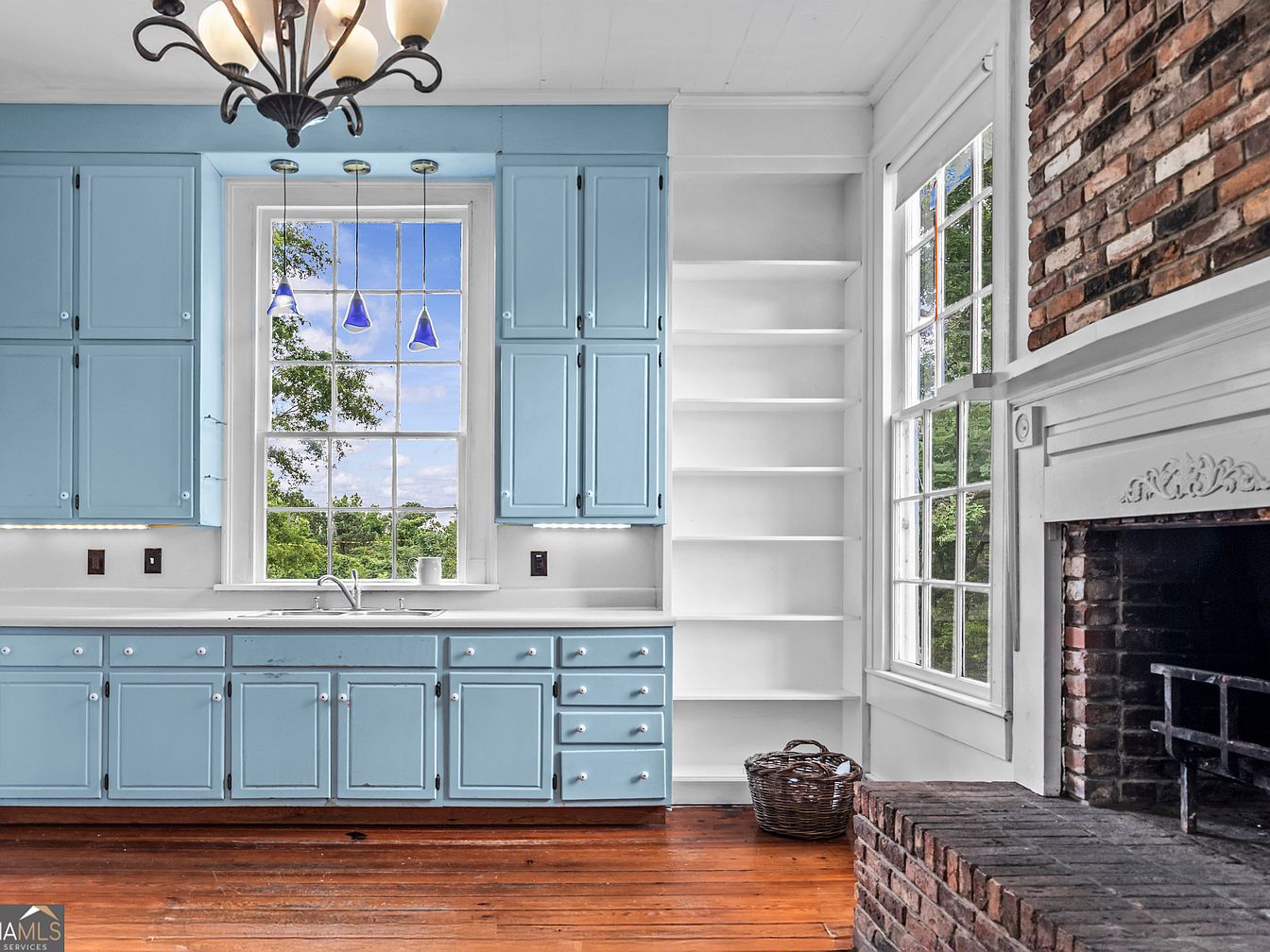 A charming kitchen space features powder blue cabinets with vintage-style hardware, arranged along the wall beneath a large, divided-pane window that fills the room with natural light. Three blue pendant lights hang above the sink, adding a touch of color and modern flair. The white countertop and white open shelving on the right enhance the airy feeling. Warm, aged wood floors contrast beautifully with the fresh colors. To the right, a traditional brick fireplace with an ornate white mantel adds historic character. Large windows and classic trim complete the look, blending rustic warmth and cheerful brightness.