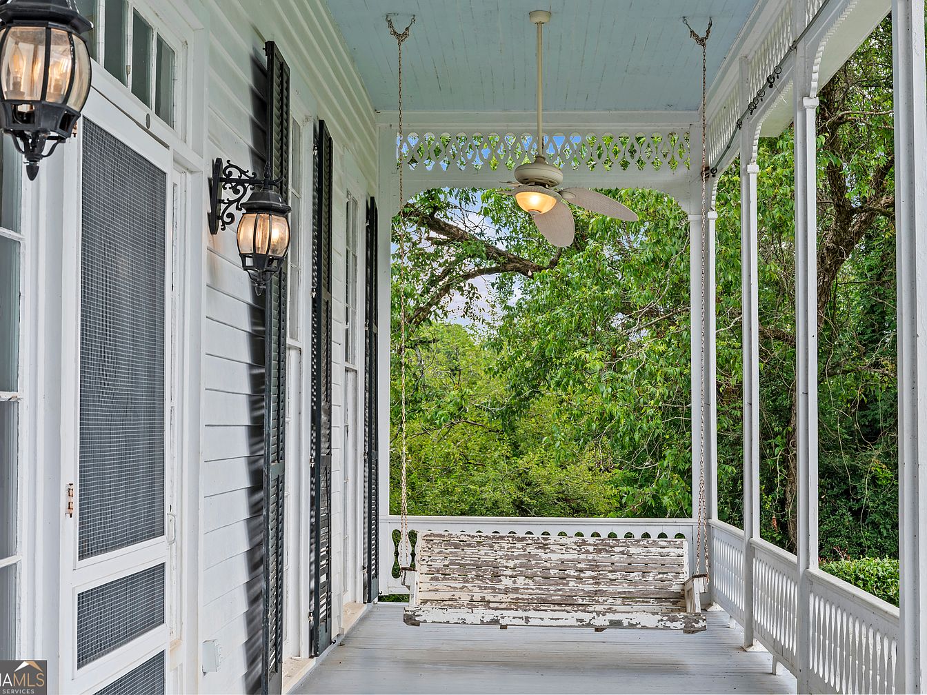 A spacious, covered porch with a pale blue ceiling, white painted wooden floorboards, and ornate trim work along the upper railing and roof. Tall white posts provide architectural detail, complemented by intricate brackets. An aged wooden porch swing with a distressed paint finish hangs from the ceiling, facing out towards lush, leafy trees. Black weathered shutters frame large windows, and two elegant wrought iron lantern sconces add vintage flair beside the screened door. A ceiling fan with oversized blades offers comfort, while the entire space conveys a classic, inviting Southern aesthetic, blending charm and relaxation with historical character.