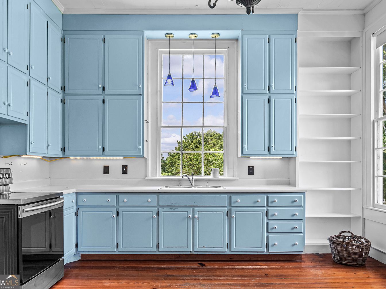 This space features a classic kitchen with powder blue cabinetry covering both the upper and lower walls, creating a fresh and airy atmosphere. Each cabinet has simple moldings and white knobs, paired with black hinges for contrast. A wide window with divided panes centers the scene, offering a view of greenery outside and flooding the kitchen with natural light. Under the window is a white countertop and sink, flanked by a modern stainless steel stove. The room has a warm, polished wood floor and crisp white shelving built into the wall, ideal for open storage. Bright blue pendant lights add a cheerful touch above the sink.