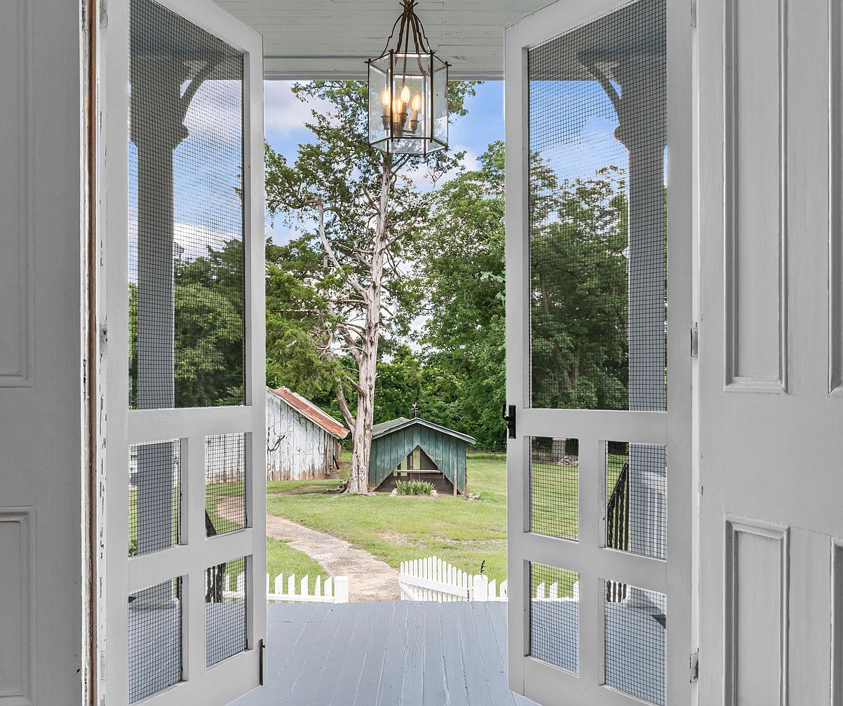 Double white wooden screen doors open onto a spacious gray-painted porch, framed by intricate columns and a white wooden ceiling. A glass lantern pendant light hangs above, casting a warm ambiance. Beyond the porch, a curved pathway leads through a neat, green lawn toward rustic outbuildings with weathered, tin roofs. A picket fence borders the porch, blending with the inviting countryside atmosphere. Mature trees and dense greenery provide a serene, natural backdrop, while the overall design emphasizes openness, fresh air, and a strong connection between indoor and outdoor spaces.
