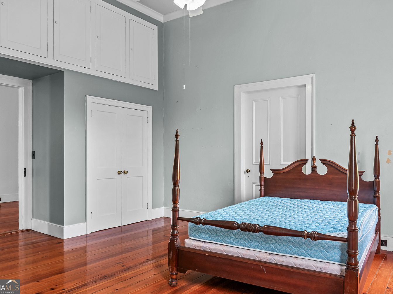A spacious bedroom features soft blue-gray walls paired with crisp white trim, creating a calm and airy atmosphere. The floor is finished in rich, warm-toned hardwood planks that add historical character to the space. A dark wood four-poster bed, with intricate turned posts and a blue quilted mattress, is the focal point of the room. Tall ceilings are accentuated by upper built-in cabinets painted white, adding extra storage above the entryway and closet. Two doors, also white, match the cabinetry and open to adjoining rooms. The overall aesthetic is classic and traditional with a hint of southern charm.