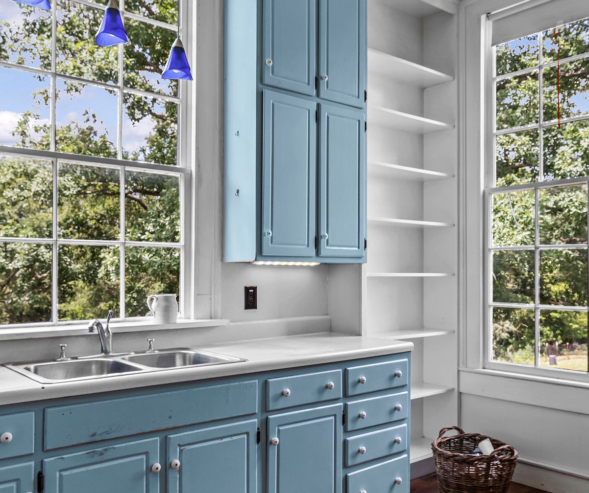 Bright and airy kitchen space featuring tall, paned windows that offer a lush view of greenery outside. A pair of stainless-steel sinks sits under one window, set in a white countertop that contrasts with vintage powder-blue cabinetry below and above. Open white shelves fill the wall beside the cabinets, ideal for displaying dishes or pantry items. A woven basket rests on the dark wood floor in the corner. The color scheme is fresh and inviting, with soft blue, crisp white, and natural wood elements. Three pendant lights with blue shades hang overhead, adding a touch of whimsy.