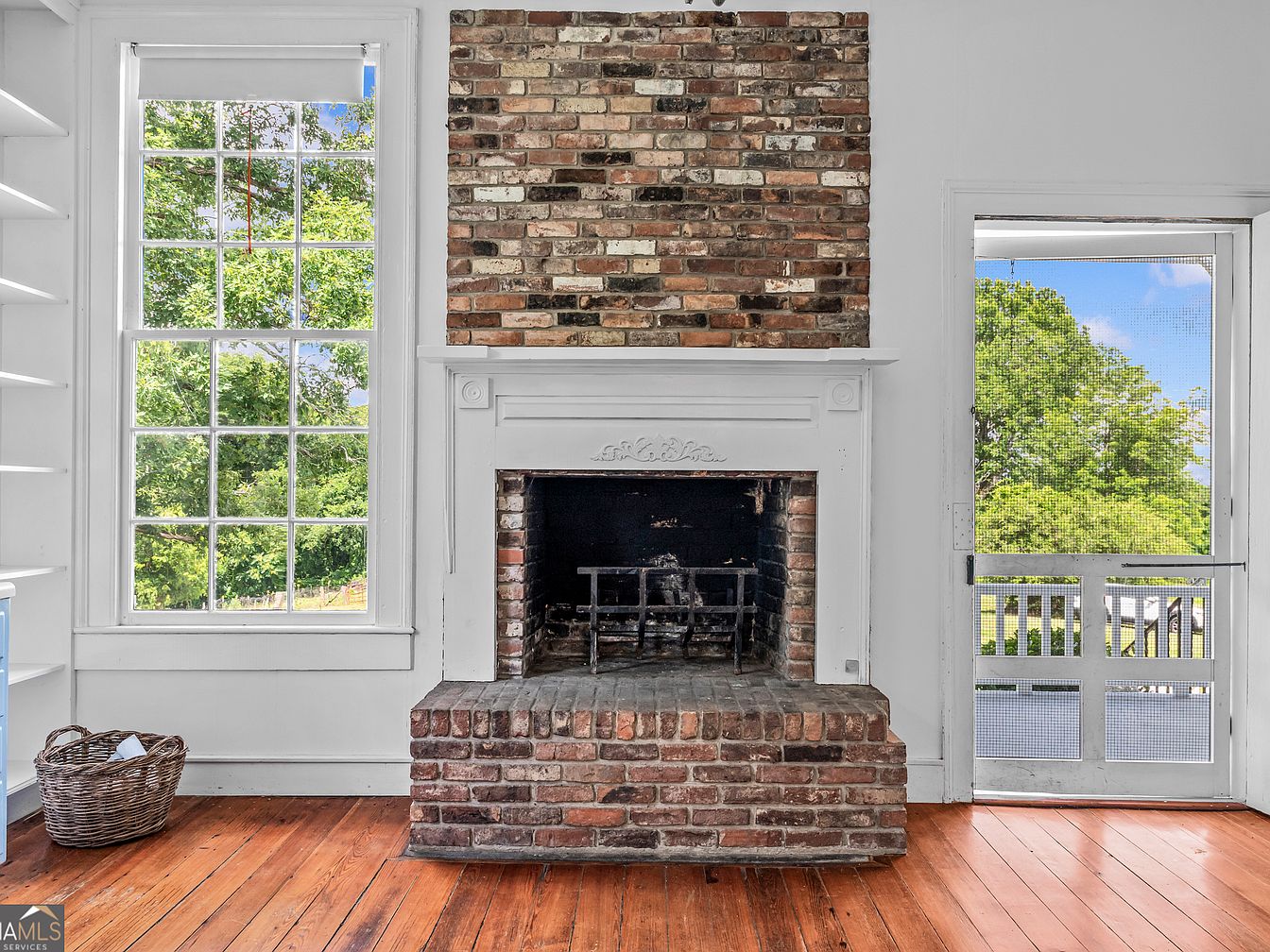 A rustic brick fireplace serves as the focal point set against crisp white walls, bordered on the left by a tall, multipaned window that floods the space with natural light and lush outdoor views. The right side features a white wood-framed screen door, opening to a porch and greenery beyond. A wicker basket sits on the polished, wide-plank hardwood floor, contributing to the room’s cozy, historic charm. Shelving lines the left edge, blending seamlessly with the white trim and enhancing the traditional American farmhouse feel. The overall aesthetic is bright, airy, and warmly inviting.