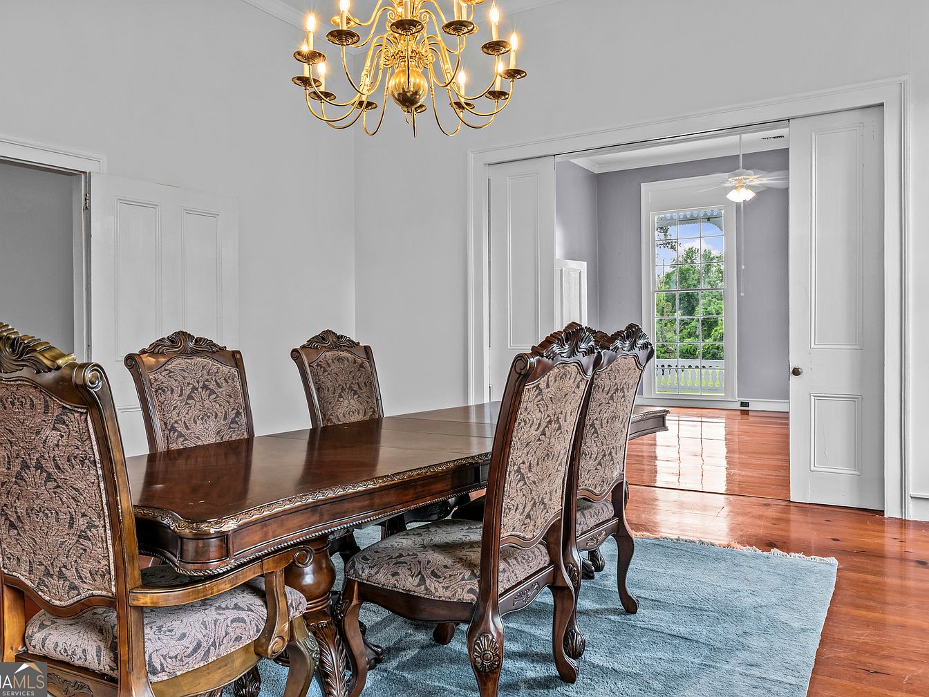 A formal dining room features a long, polished wooden table surrounded by six intricately carved chairs upholstered in patterned fabric. A plush blue rug anchors the seating area on top of glossy honey-toned wood floors. Overhead, an ornate gold chandelier with candle-style bulbs adds a touch of elegance and historic charm. The walls are painted crisp white, complemented by tall double pocket doors that open to a bright adjacent room with large windows and soft lavender walls. The room exudes classic sophistication, blending traditional furniture with clean, airy architecture and views of lush greenery outside.
