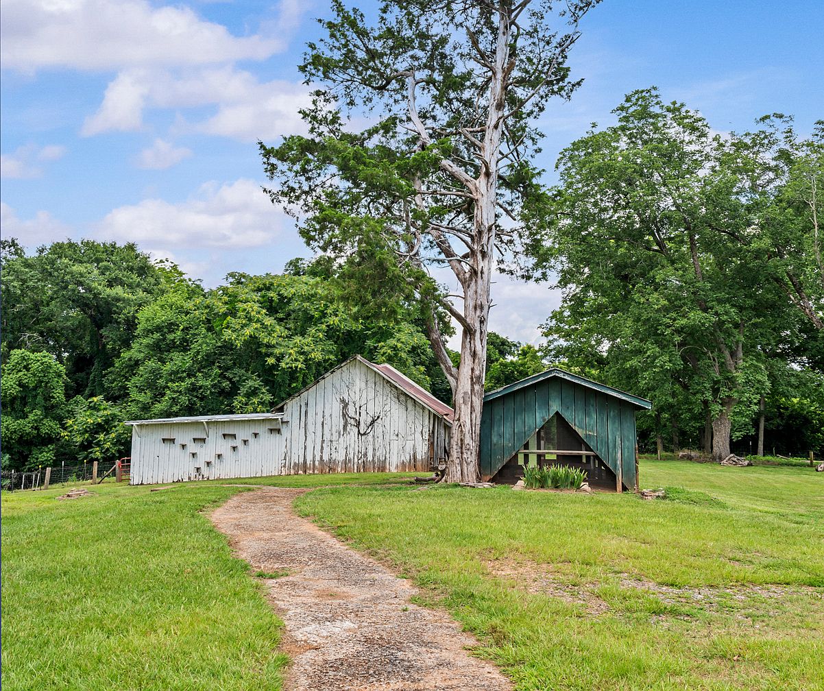 A gently winding dirt path leads across a bright green lawn to two rustic farm structures at the edge of the property. On the left stands a weathered white barn, its paint peeling in places, with a shallow sloped roof and multiple small, square openings along the wall. To the right is a smaller green outbuilding with an open gable front supported on wooden posts. A tall, old tree with peeling bark stands between the two structures, its branches reaching up into a vivid blue sky. Dense, mature trees frame the scene, providing a lush, shaded backdrop for the rural setting.