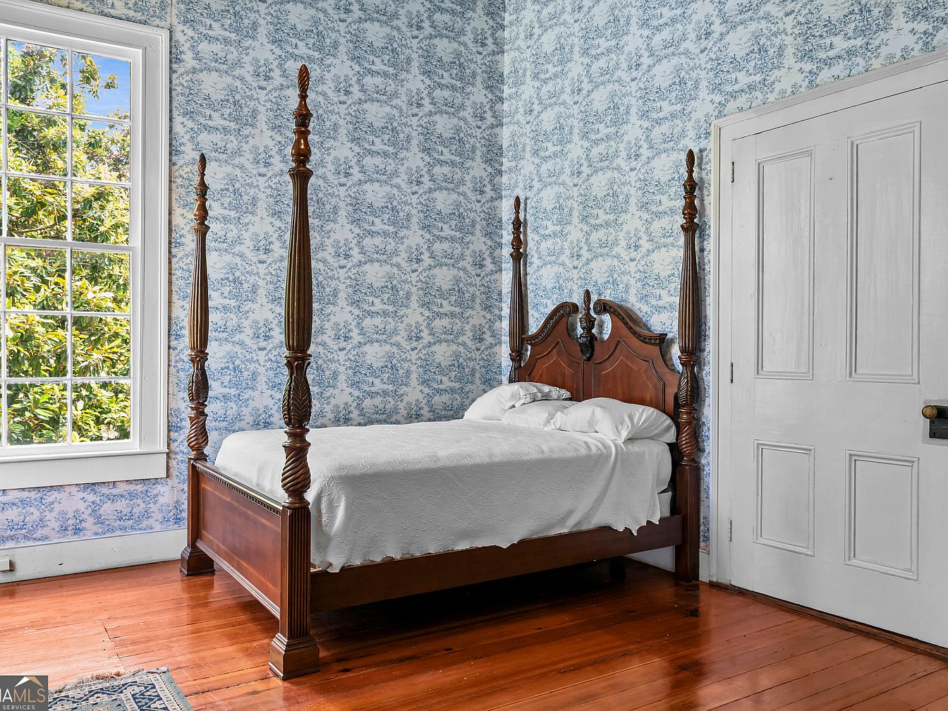Tall ceilings and soft, natural daylight fill this historic bedroom, featuring a large window with white trim. The centerpiece is a dark wood four-poster bed with intricately carved head and footboards, dressed in crisp white bedding. The pale blue and white toile wallpaper evokes a classic, serene atmosphere, complementing the polished warm reddish-brown wood floorboards. A white paneled door with vintage hardware adds to the room’s period character. The combination of elegant patterns, antique woodwork, and light, airy tones creates a tranquil, timeless aesthetic that highlights the home’s historical charm and refined simplicity.