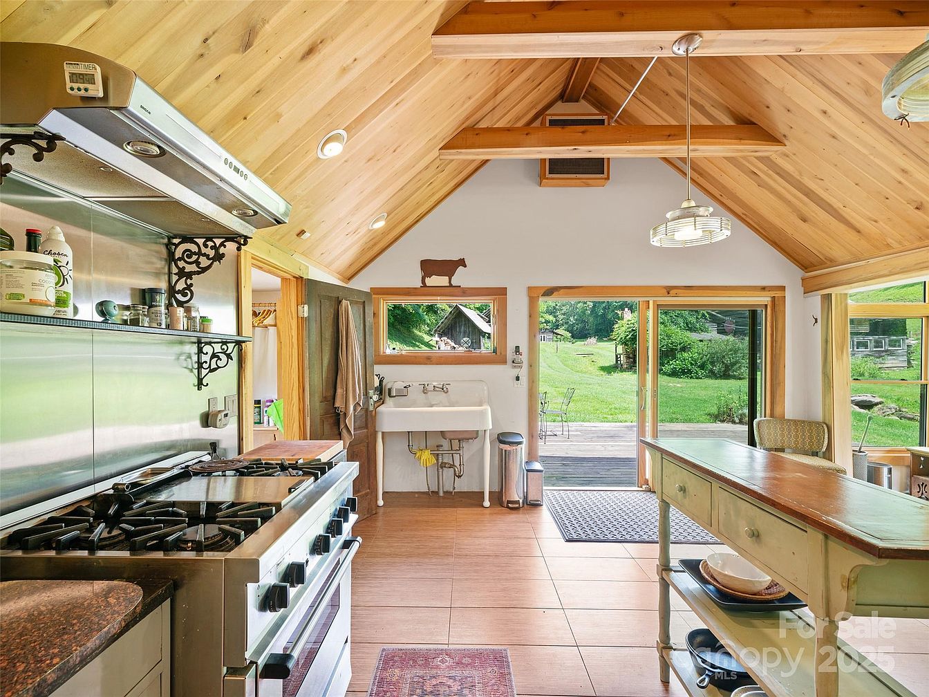 The kitchen features a spacious layout with a high, vaulted ceiling showcasing wooden beams and a natural wood finish. Stainless steel appliances, including a large gas range, are complemented by a sleek, modern design. A beautiful countertop made of polished granite offers ample workspace. A vintage-style sink sits against the back wall, paired with rustic cabinetry. Natural light floods the space through large windows, seamlessly connecting the outdoors with views of lush greenery. The earthy color scheme includes warm browns and soft whites, while decorative elements like a delicate pendant light and a patterned rug add character and charm.