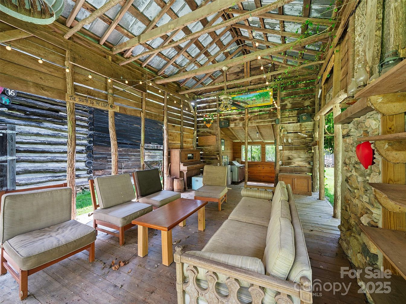 This rustic outdoor living space features exposed wooden beams and a high vaulted ceiling, combining natural elements with a homely vibe. Various seating arrangements with simple upholstered couches surround a wooden coffee table, promoting casual gatherings. Light bulbs strung across the beams create a warm ambiance. The walls, composed of horizontal logs and slatted wood, exhibit a weathered charm, showcasing the age of the structure. Near the back, a vintage wooden cabinet adds an element of functionality. Lush greenery peeks in through open sides, integrating the outdoor environment into this cozy retreat.