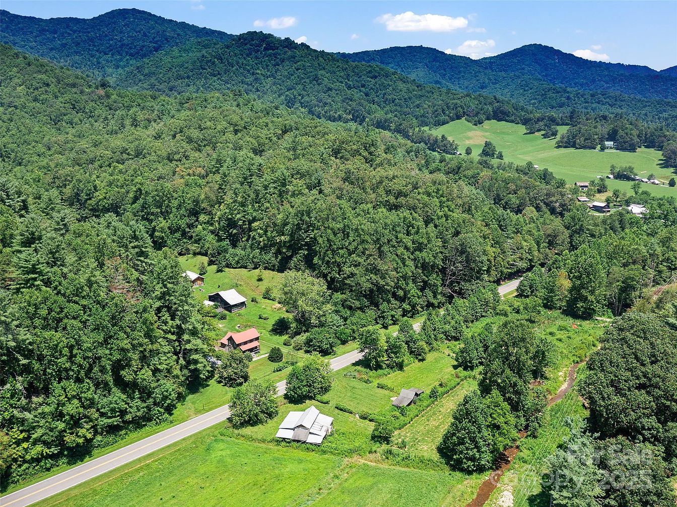 A sweeping aerial view of a serene countryside landscape showcases a collection of historic homes nestled among lush greenery. The scene reveals a mix of structures, including wooden houses with earthy tones and a few metal rooftops, harmonizing with the vibrant greenery. Rolling hills rise majestically in the background, creating a picturesque backdrop filled with dense trees and patches of open fields. The rich shades of green contrast starkly with the warm accents of the rooftops, highlighting the natural beauty of the region. A meandering road cuts through the property, providing a sense of access and connection to the pastoral setting.
