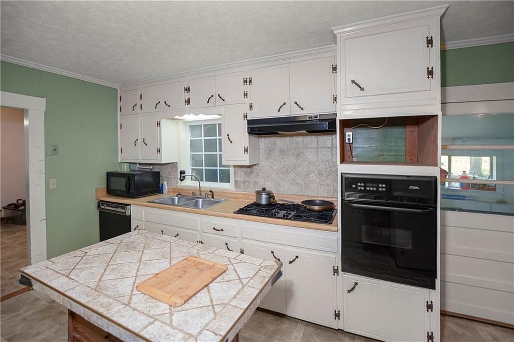 A traditional kitchen with soft sage green walls and white cabinetry featuring vintage-inspired metal handles. The workspace is organized around a large window above a double sink, offering natural light for the main counter area. The counter has a light wood surface, while an island with a tiled top and a wooden cutting board sits in the foreground, providing extra prep space. The room features a black wall oven, a built-in gas stove, a microwave, and a dishwasher. Subtle crown molding, tiled backsplash behind the stove, and a gentle mix of muted and natural hues create a cozy, functional atmosphere.
