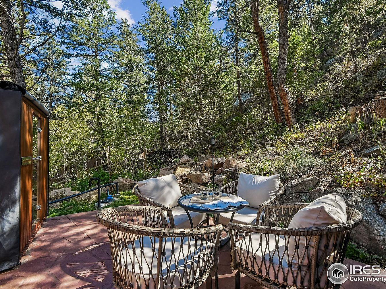 Charming outdoor patio nestled at the edge of a wooded hillside, surrounded by tall evergreen trees and natural stone landscaping. The space features four round, woven wicker chairs with plush, light-colored cushions arranged around a small circular glass table, perfect for family gatherings or outdoor dining. A red stone patio underfoot adds rustic character, while a wooden wall and glass doors provide a smooth transition to the indoors. The area offers both privacy and an inviting ambiance for all ages to relax, play, and enjoy nature in a serene, sun-dappled setting, ideal for creating lasting family memories.