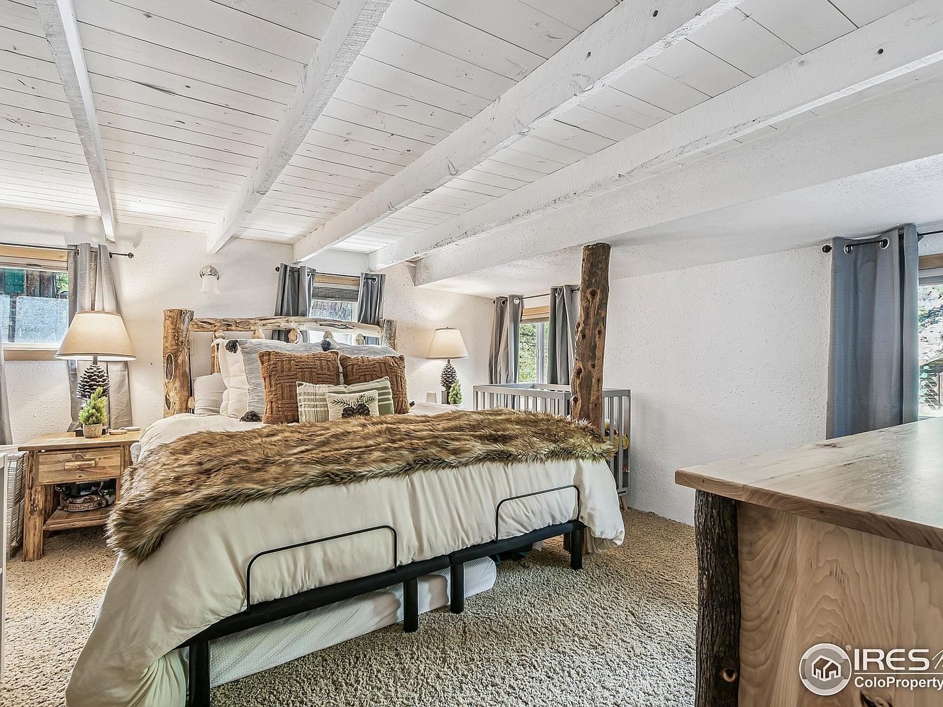 A cozy family-friendly bedroom with a warm, rustic aesthetic and natural wood accents. The centerpiece is a log-frame king bed layered with plush white linens, brown textured accent pillows, and a faux fur throw. Matching log nightstands stand on either side, each topped with lamps and charming pinecone decor, creating a relaxing and inviting atmosphere. Soft carpet covers the floor, perfect for children to play on. Four windows, dressed in soft gray curtains, allow natural light to brighten the space. A wooden crib nestled beside the bed highlights the room’s suitability for families with young children. The exposed white beams and timber posts add character and a sense of openness.
