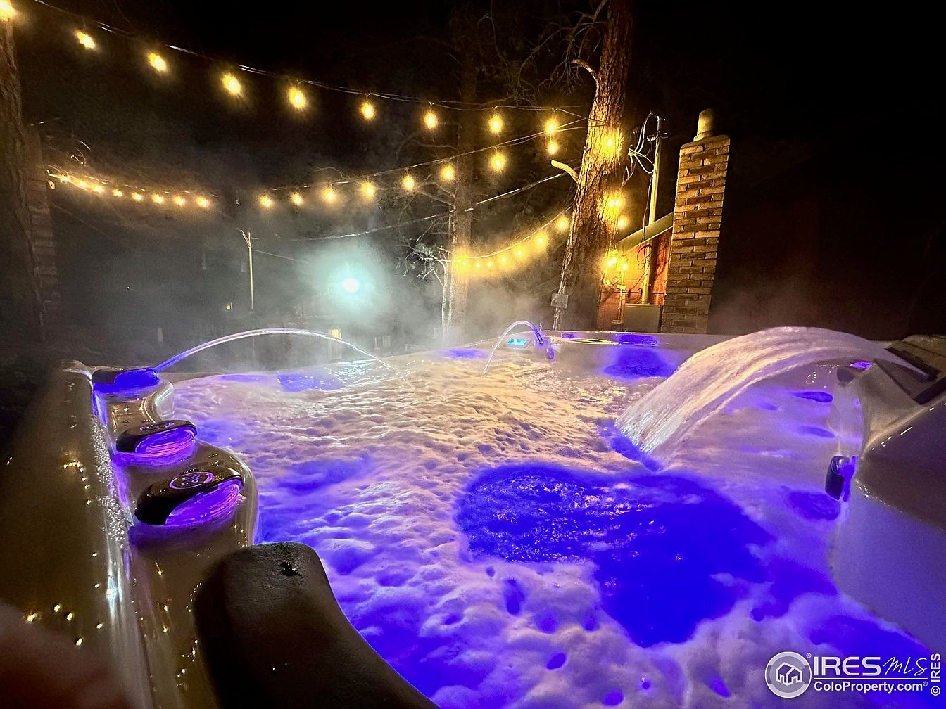 A bubbling outdoor hot tub illuminated by vibrant blue LED lights creates a welcoming and relaxing atmosphere perfect for families. Surrounding the tub, a canopy of soft golden string lights is suspended between trees and a rustic brick chimney, offering warmth and ambiance for evening gatherings. The hot tub features built-in headrests and cup holders, providing comfort and convenience for everyone. The mist from the warm water contrasts beautifully with the cool night air, making this space inviting all year round. This well-designed area is ideal for family relaxation, entertaining friends, or enjoying peaceful quiet moments together.