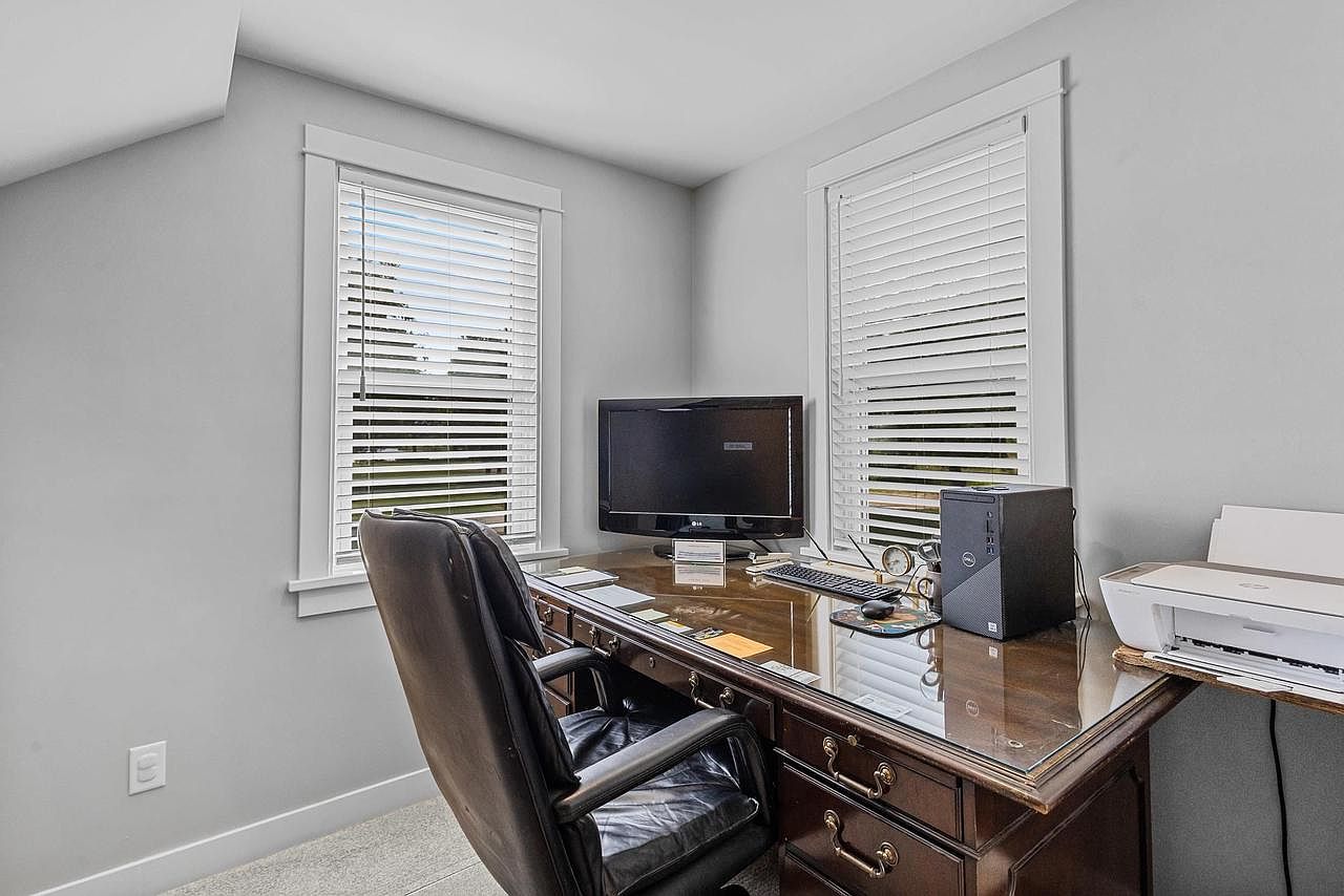 This home office features a clean and modern aesthetic, with light gray walls that create a serene atmosphere. Two windows at the corners allow ample natural light to fill the space, framed by classic white trim and fitted with horizontal blinds for privacy. A large, polished wooden desk dominates the room, complemented by a comfortable black leather office chair. On the desk, a computer monitor sits alongside a printer, reflecting a functional workspace. The room has a minimalist layout, enhancing the cozy yet professional setting, ideal for focused work or study.
