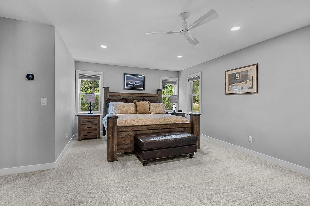 This serene bedroom features a spacious layout enhanced by soft gray walls and natural light from large windows on either side of the wooden bed. The centerpiece is a sturdy wooden frame bed dressed in crisp white linens and patterned throw pillows, harmonizing comfort with rustic charm. A dark leather bench sits in front for added seating. On either side, matching nightstands with decorative lamps provide ambient lighting. A carefully chosen artwork hangs above the bed, adding a personal touch. The plush carpet underfoot contributes to the cozy atmosphere, creating an inviting retreat.