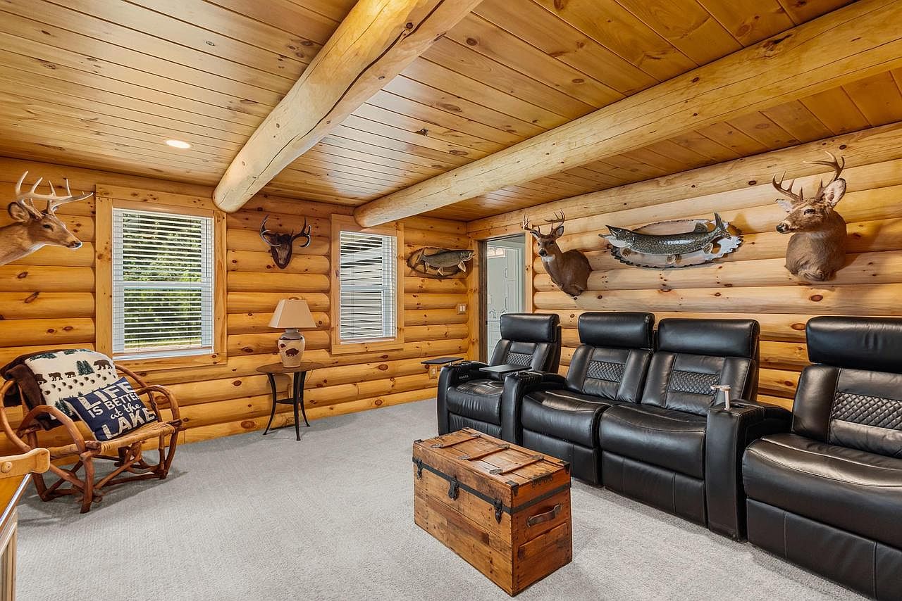 A cozy game room showcases rustic log walls with a warm, natural wood finish. The ceiling features exposed beams, enhancing the cabin-like aesthetic. Plush black reclining seats are arranged in front of a central coffee table, adding comfort for gatherings. Adorning the walls are various mounted animal trophies, including deer heads and a fish, which contribute to a vintage hunting lodge theme. Large windows allow natural light to filter in, illuminating the soft gray carpeting that anchors the space. A decorative lamp and a chair with a nature-themed cushion offer additional seating, enriching the inviting atmosphere.