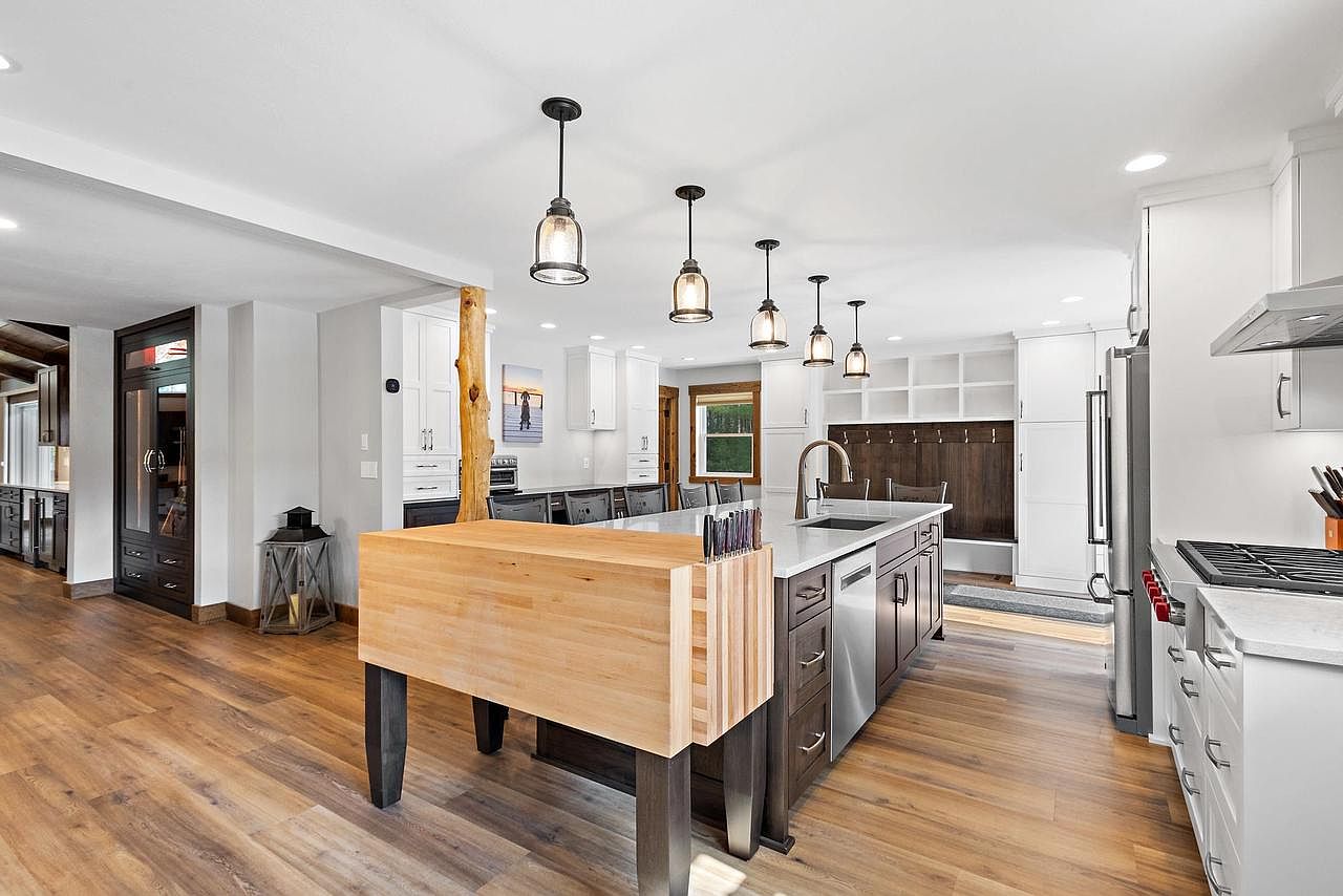 A modern kitchen featuring an open layout with a blend of dark wood accents and pristine white cabinetry. The centerpiece is a large island with a light wooden countertop, providing ample workspace. Above, pendant lights in a rustic style illuminate the area, enhancing the cozy atmosphere. Stainless steel appliances are seamlessly integrated, with a sleek cooking range and refrigerator contrasting with the cabinetry. A large window allows natural light to flood the space, showcasing green views outside. The flooring is a warm wood tone, harmonizing with the kitchen’s overall aesthetic, creating a welcoming and functional environment.