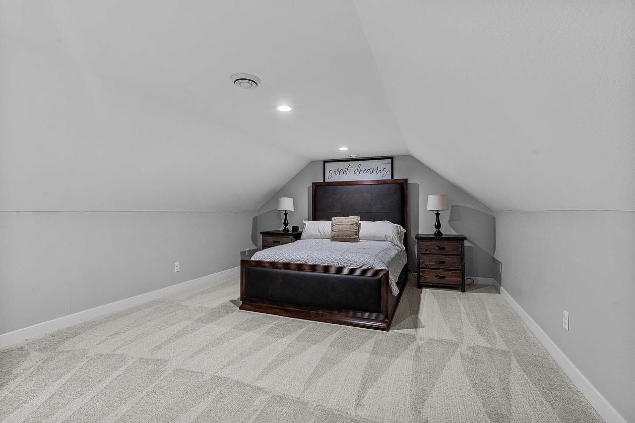This cozy attic bedroom features a slanted ceiling, enhancing its intimate atmosphere. The color scheme consists of soft gray walls and warm beige carpet, providing a calming backdrop. The centerpiece is a dark wooden bed with a padded leather headboard, paired with subtle decorative pillows. Flanking the bed are two sleek nightstands, each topped with stylish lamps for ambient lighting. Above the bed, a charming sign reads ‘sweet dreams’, adding a personal touch. Overall, the room combines modern elegance with a sense of comfort, making it an inviting retreat.