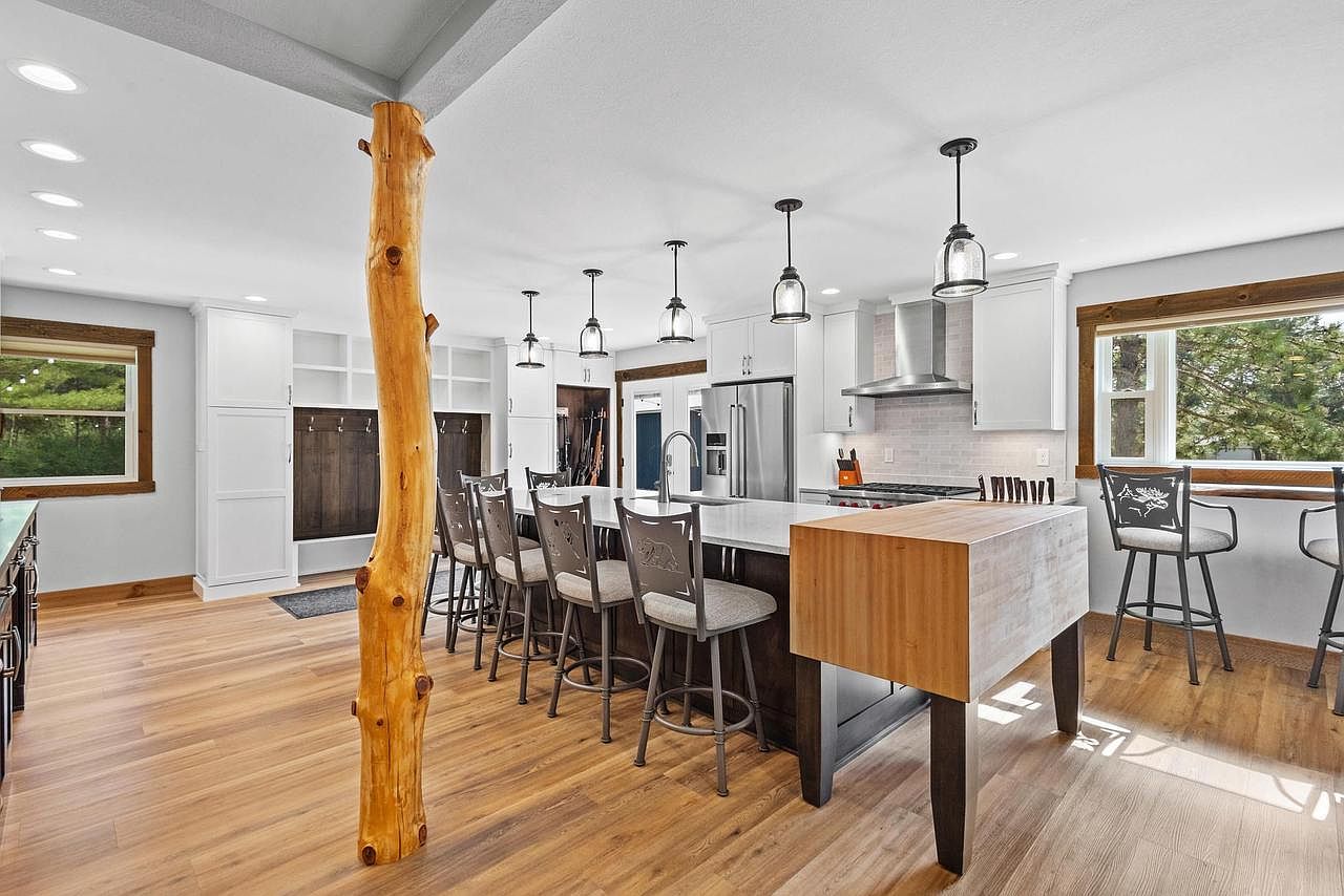 This kitchen features a spacious layout with a modern design. Light wooden flooring complements white cabinetry and a contrasting dark island. A standout natural wood column adds rustic charm, enhancing the warm aesthetic. The countertop is stone, offering durability and style. Bright pendant lights hang above barstools, while a window lets in natural light, providing a view of the outdoors. The stainless steel appliances, including a range hood and refrigerator, integrate seamlessly. Open shelving is paired with a tall cabinet, adding functional storage. The overall color scheme balances light and dark, promoting a contemporary yet inviting atmosphere.