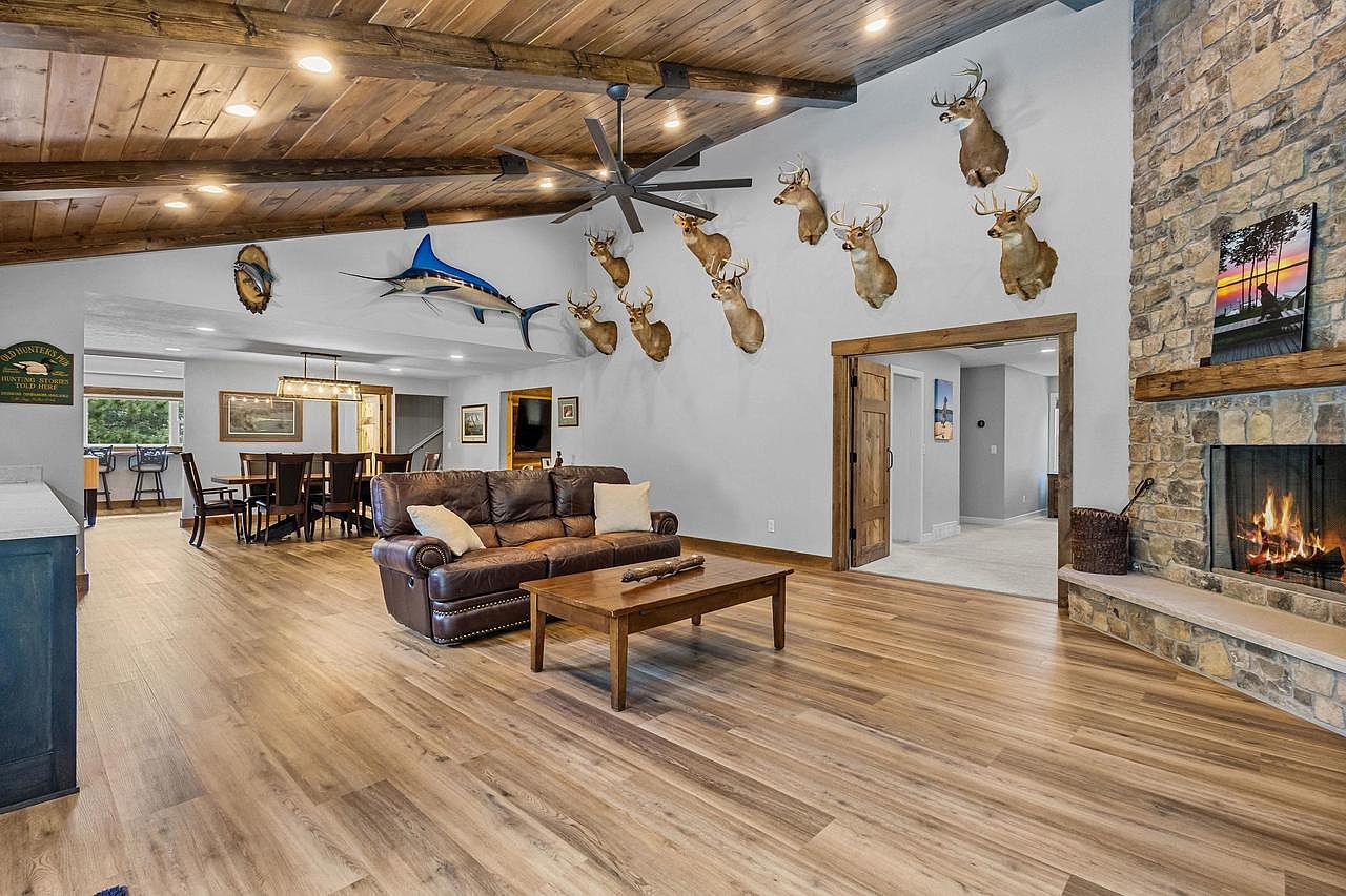 This spacious living room features a rustic ambiance with a blend of modern and traditional design elements. Exposed wooden beams run along the ceiling, while a stone fireplace adds warmth and character. A large leather sofa, accented with cozy cushions, is centrally located atop wide plank flooring that enhances the room’s earthy feel. The wall displays mounted deer heads and a large fish, emphasizing a hunting theme. Natural light floods in through the windows, contrasting with the soft gray walls. A wooden coffee table stands in front of the sofa, completing the inviting atmosphere of this communal space.