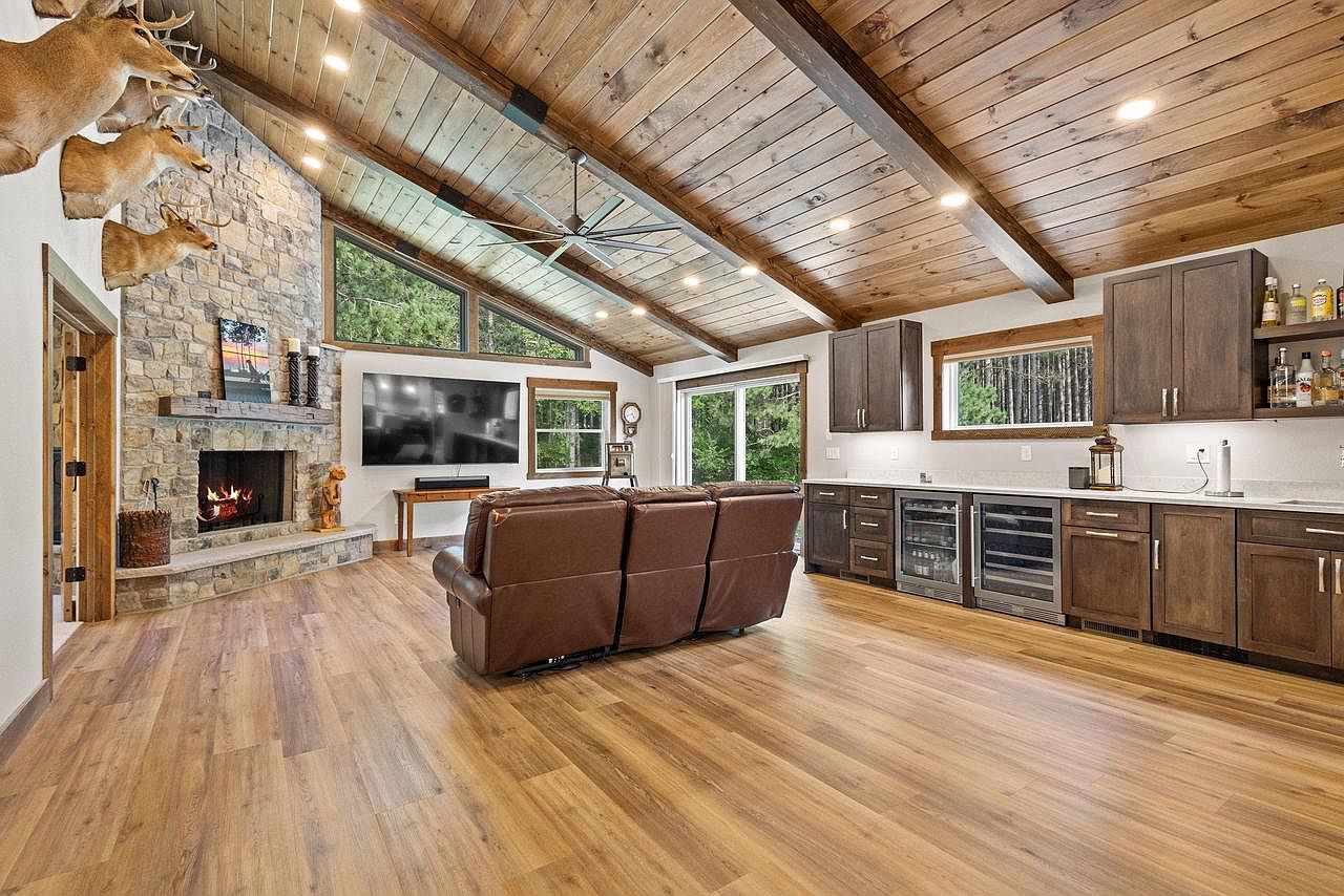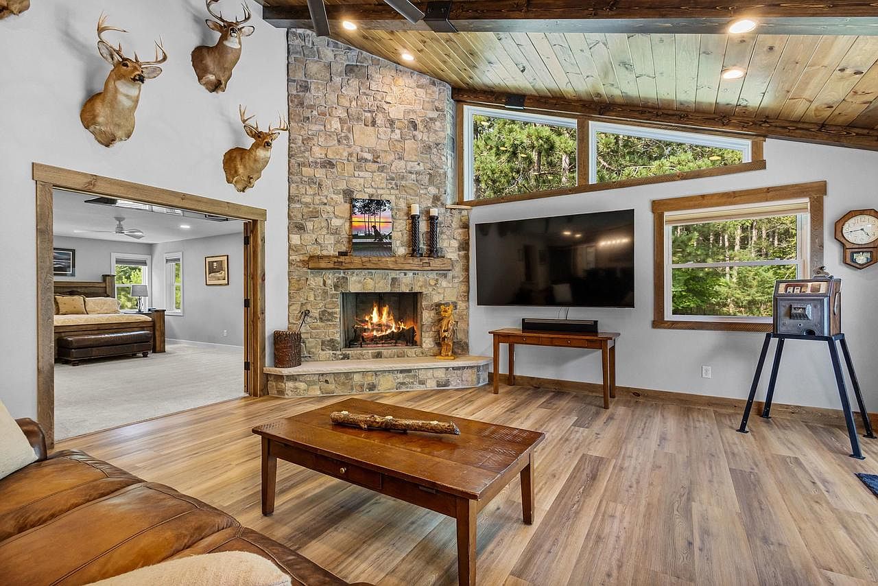 This inviting living room showcases a stunning stone fireplace as the focal point, framed by large windows that invite natural light and a view of the surrounding greenery. The combination of wood and stone materials creates a warm, rustic ambiance. A cozy leather couch provides comfortable seating, accompanied by a simple, handcrafted wooden coffee table. Light hardwood flooring complements the room’s earthy tones. Wall-mounted decor, including mounted deer heads, adds character, while a flat-screen TV offers modern convenience. The overall aesthetic blends traditional lodge elements with contemporary design, perfect for relaxation or entertainment.