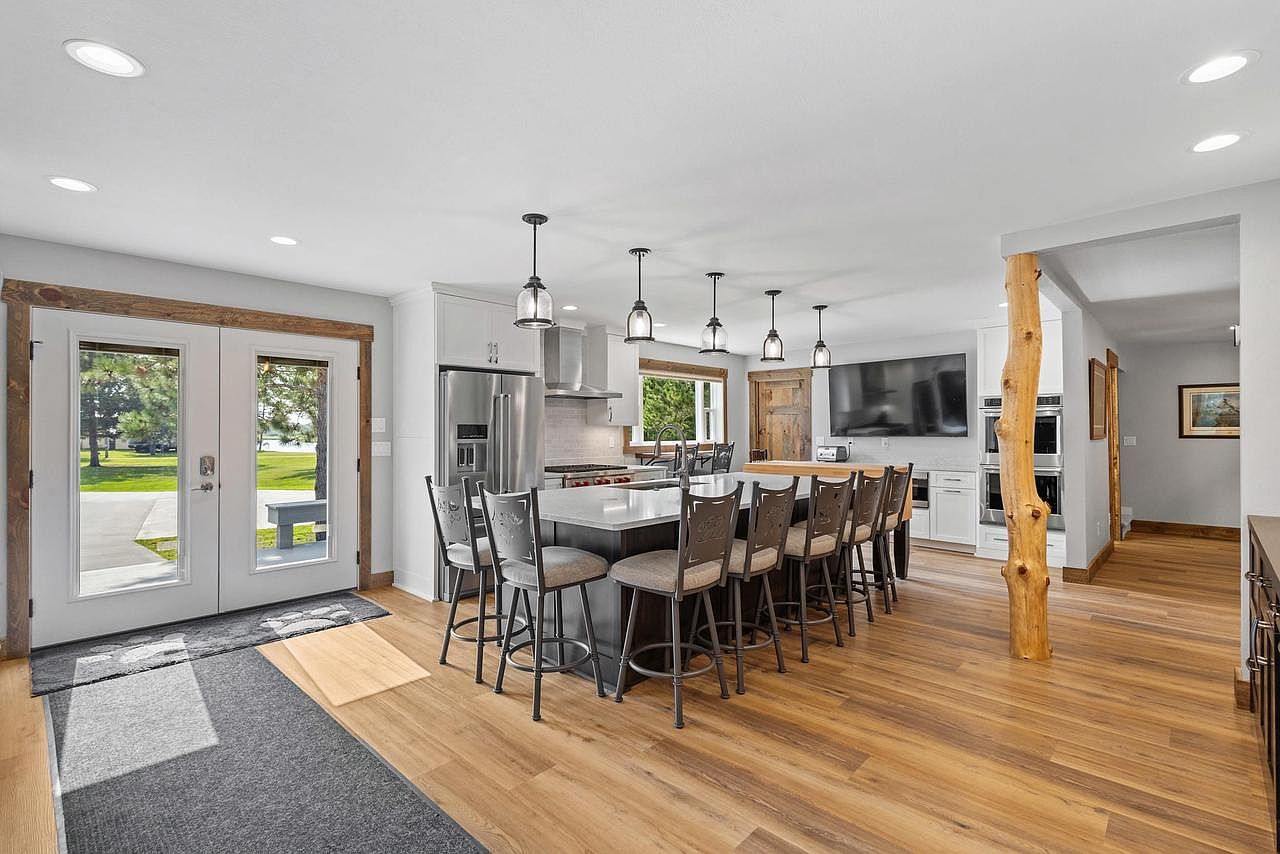 This open-concept kitchen features a spacious layout with a large island at the center. The island is surrounded by sleek, high-back barstools, emphasizing a modern yet inviting aesthetic. Warm wood tones from the flooring and structural beams contrast with the light, neutral cabinetry and stainless steel appliances. Recessed lighting illuminates the room, enhancing its inviting atmosphere. Two sets of double doors provide ample natural light and a view of the outdoors, complemented by a cozy entry mat. Overall, the design merges contemporary features with rustic charm, creating a functional and stylish cooking space.