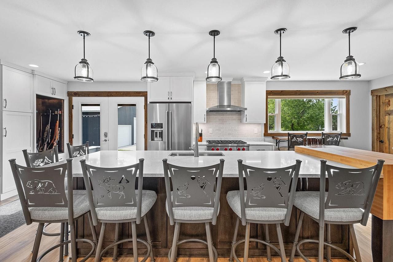 This modern kitchen features a spacious island surrounded by stylish metal bar stools with intricate wildlife designs. A sleek white countertop contrasts with dark wooden cabinetry, enhancing warmth. Pendant lights hang above, casting a soft glow. The back wall showcases stainless steel appliances, including a refrigerator and a professional-grade stove with a chic hood. Large windows allow natural light to flood the area, while rustic wooden accents around the windows provide a cozy touch. The layout is functional, encouraging interaction, and the overall aesthetic blends contemporary design with a touch of nature, perfect for both cooking and entertaining.