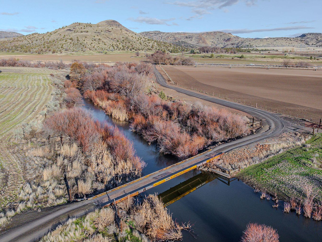 A picturesque scene featuring a modest bridge spanning a gently flowing creek, surrounded by autumn-hued vegetation. The bridge, painted in a muted yellow, contrasts beautifully with the calm water beneath. On either side, dry grasses and shrubs in shades of brown and gold frame the scene, contributing to a rustic aesthetic. Sloping hills in the background, dotted with patches of evergreen trees, rise against a backdrop of a clear blue sky with wispy clouds. The nearby farmland shows organized rows of crops, emphasizing the harmonious blend of nature and agriculture in this serene landscape.