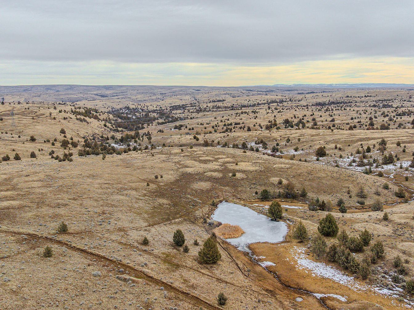 Sprawling hills stretch across the horizon, dotted with clusters of evergreen trees. The terrain is primarily a muted tan, interspersed with patches of green vegetation. A small pond glimmers in the foreground, partially frozen, reflecting the overcast sky. The seasonal transition is evident with remnants of snow scattered amidst the brown grass. Low, rolling hills create a natural undulation in the landscape, leading the eye toward the distant mountains. The overall atmosphere is tranquil, evoking a sense of solitude and connection to nature, with a soft, diffused light casting gentle shadows across the terrain.